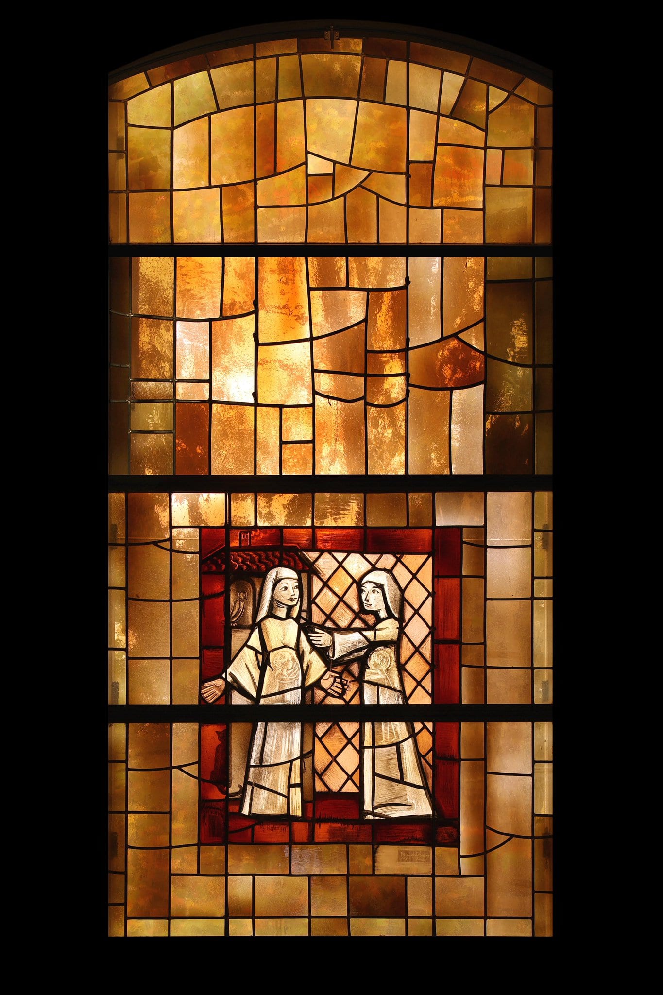 Marie et Elisabeth s'accueillent les bras ouverts. Dans leur ventre on aperçoit l’enfant Jésus et Jean-Baptiste. Cette scène en grisaille est encadrée d’une bordure orange et est placée au bas du vitrail non figuratif.