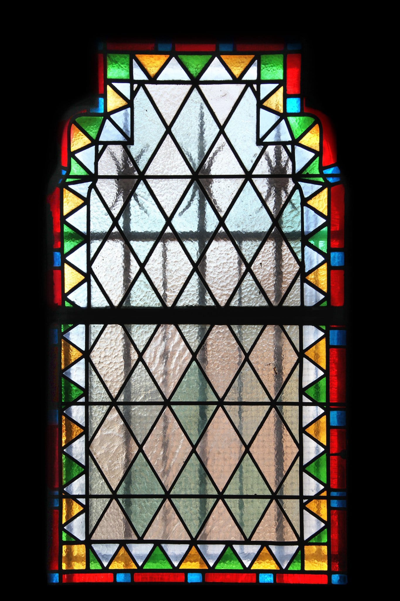 Vitrail à losanges encadrée d'une double bordure décorative colorée