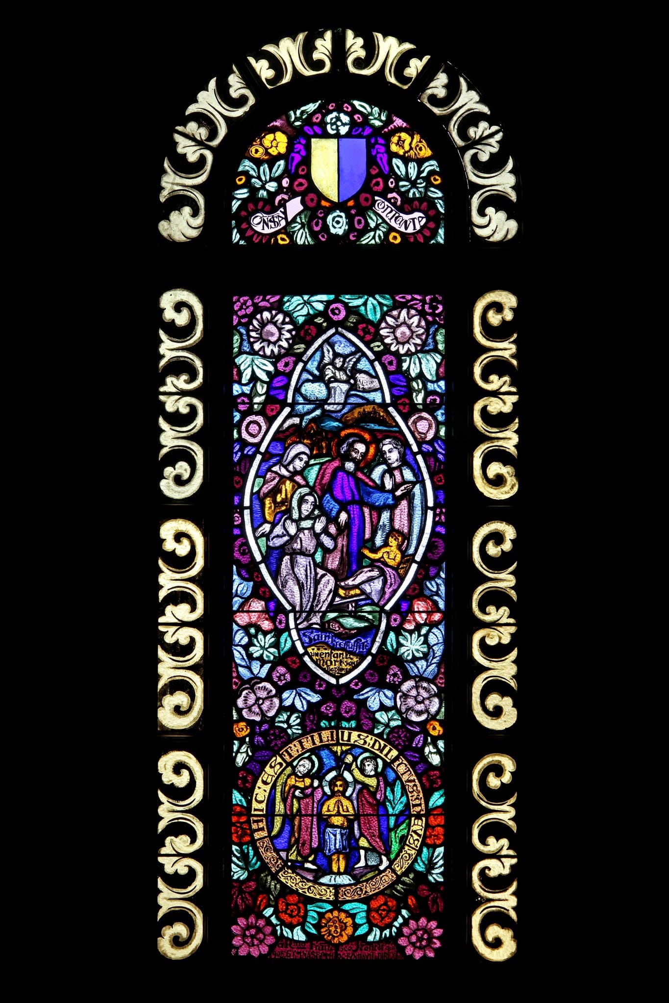 CONSTAN[TIA]/ CONTENTA (banderole en haut) // Le / Saint Rressussite / un enfant / mort sans / Baptême (banderole sous scène centrale) // HIC : EST : FILIUS : DILECTVS : MEVS (médaillon en bas) // à Rmo Francesco Jeantet qui / 1905 : GYMNSIVM : HOC . FVNDAVIT . DIREXIT 1912 (en bas)