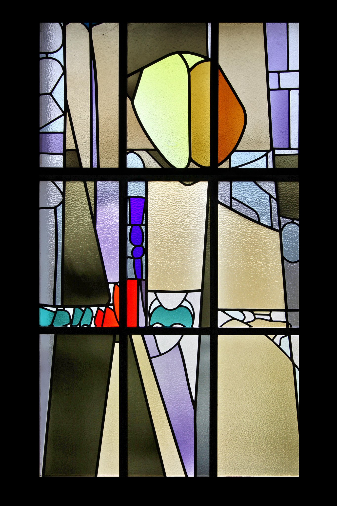 Vitrail non figuratif aux teintes beiges, mauves, grises et jaunes.
