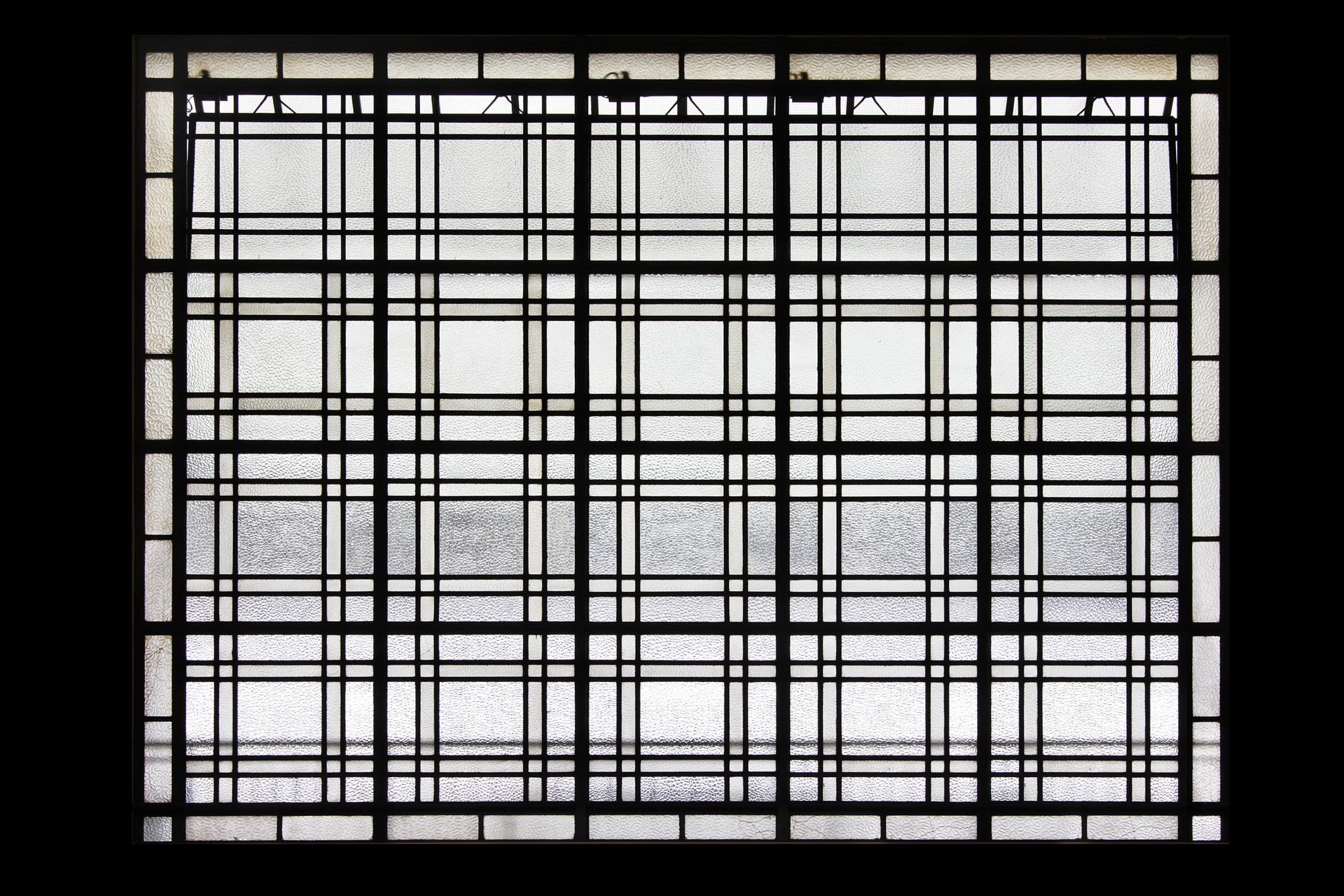 Verrière ornementale géométrique composée en verre blanc et fer forgé.