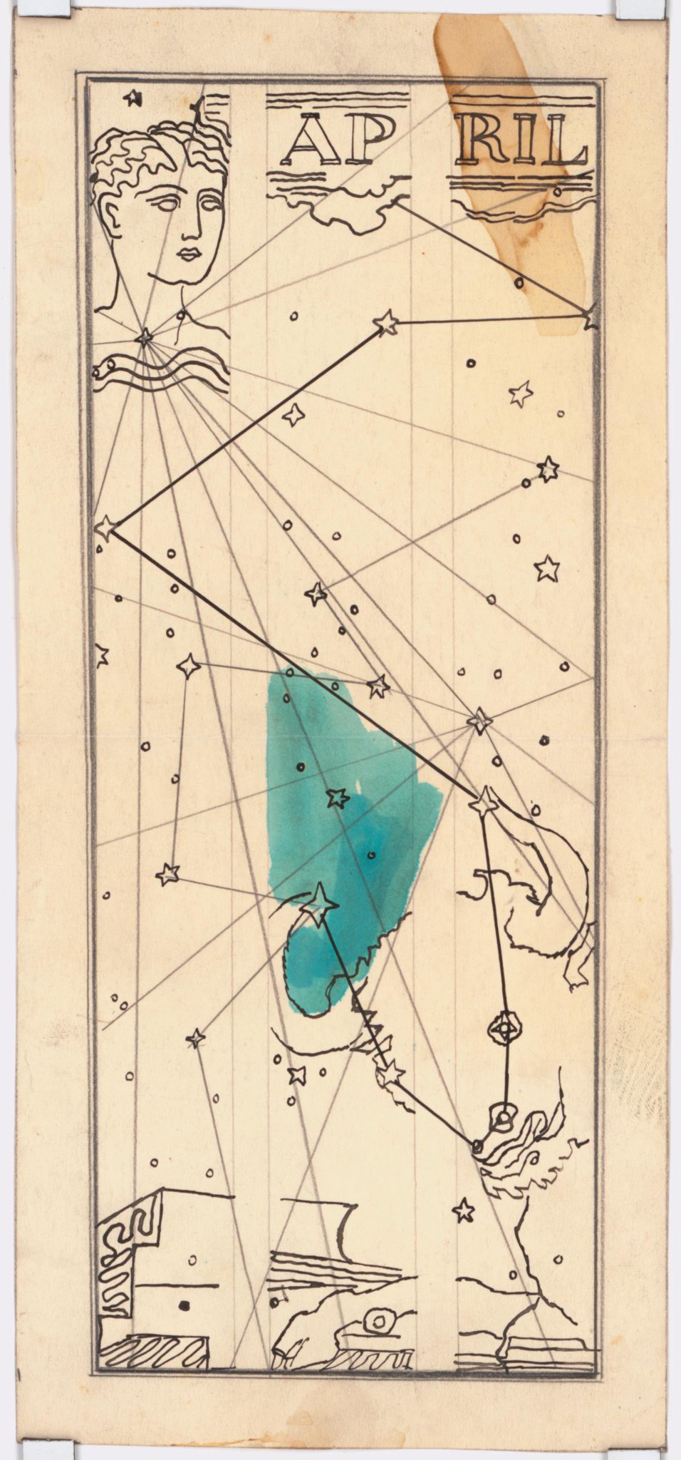 Projet pour des vitraux sur le thème de la "carte du ciel" : vitrail du mois d'avril et du signe du Taureau : en bas, la tête du Taureau qui suit le tracé de sa constellation, en haut, buste de personnage (personnification de la constellation de Persée ?). La composition est traversée par les tracés des constellations et des étoiles.