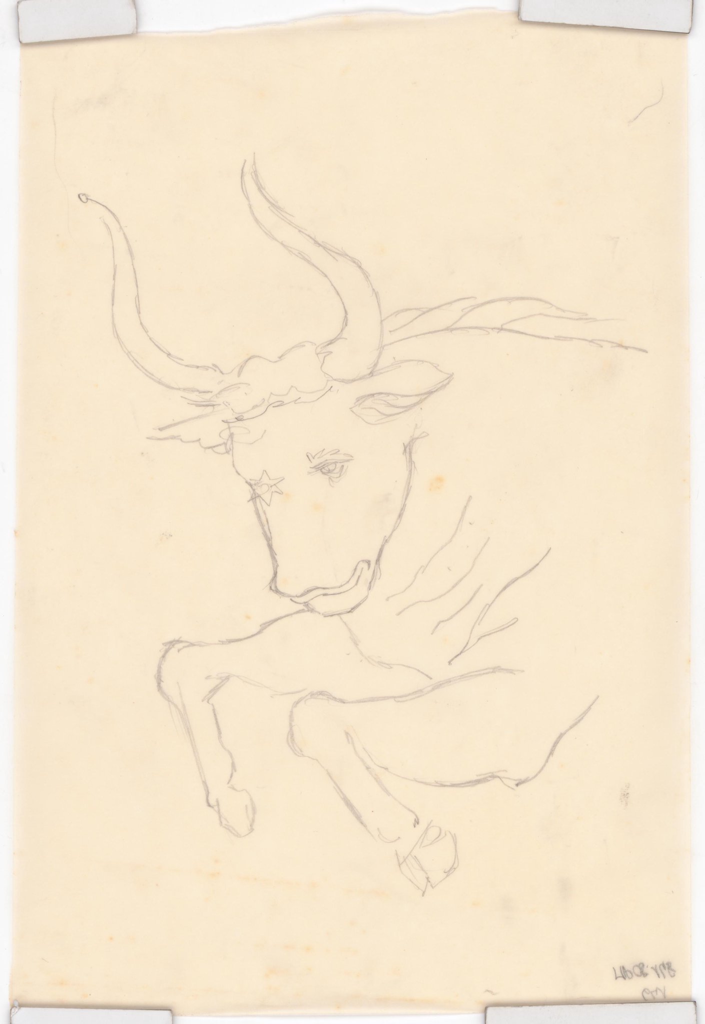 Projet pour les vitraux sur le thème de la "carte du ciel": personnification du signe du Taureau, représenté couché, les pattes repliées devant lui.