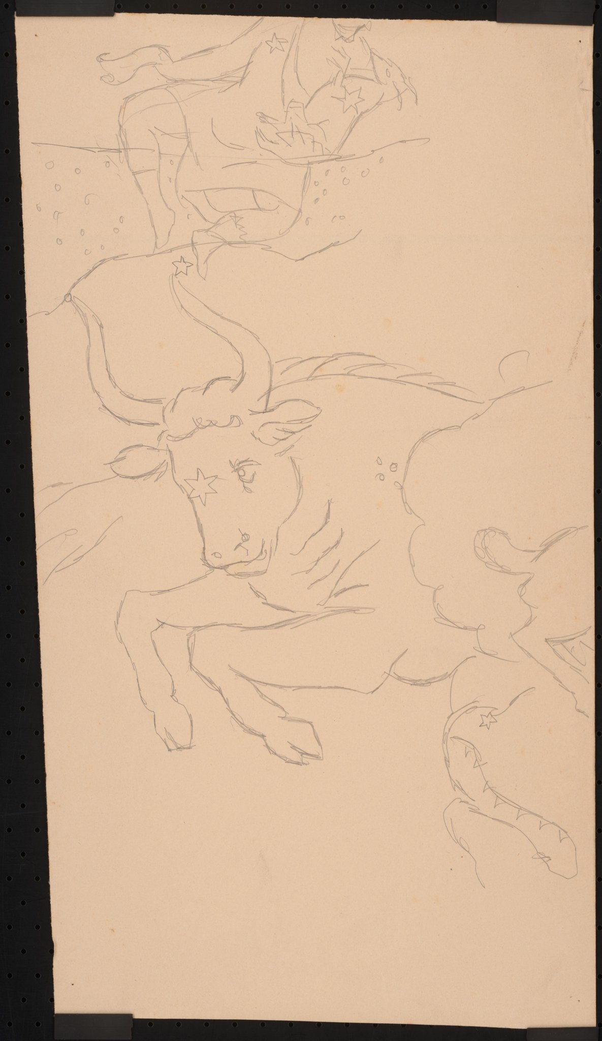 Projet pour les vitraux sur le thème de la "carte du ciel": personnification du signe du Taureau en train de sauter, surmonté de la représentation d'un personnage assis portant un petit animal cornu (?).