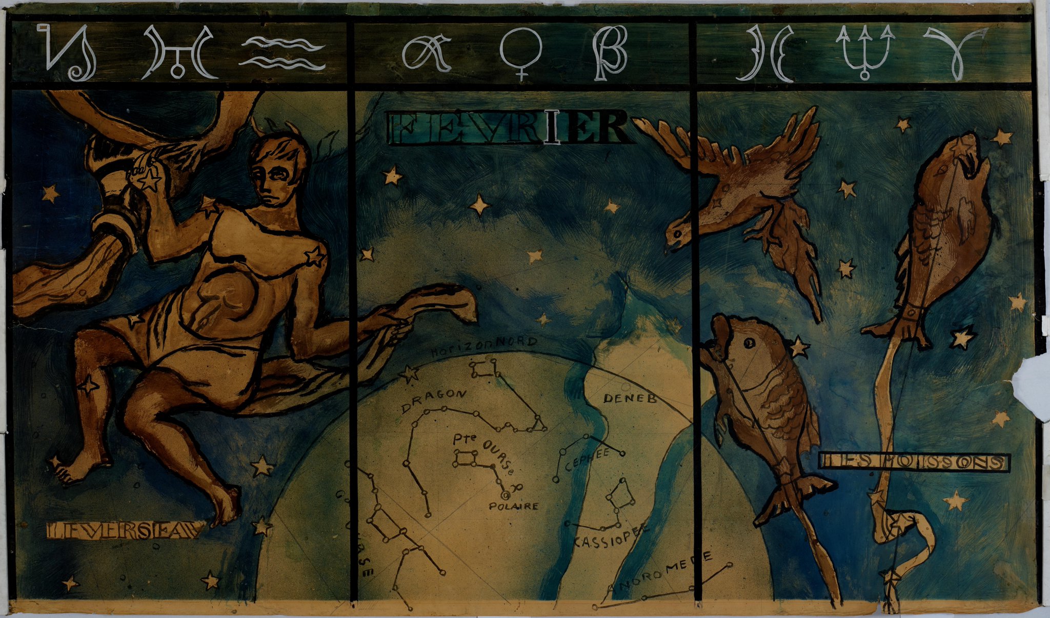 Carton en couleur pour les vitraux sur le thème de la "carte du ciel" : les personnifications des signes du Verseau, à gauche, et des Poissons, à droite, autour d'un cercle central comprenant les constellations, (dont seule la moitié supérieure est dessinée ici). La personnification de la constellation du Corbeau est représentée en haut à droite, et au sommet, les symboles des signes du zodiaque. (L'ensemble est complété par MP 08.174). Au verso : les personnifications des signes des Gémeaux, à gauche, et du Cancer, à droite, autour d'un cercle central comprenant les constellations, (dont seule la moitié supérieure est dessinée ici). La personnification de la constellation de la Licorne est représentée en bas à gauche, et celle de la constellation du Compas en haut à droite. Au sommet, on trouve les symboles des signes du zodiaque (l'ensemble est complété par le verso du MP 08.174)