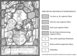 Im oberen Scheibendrittel zahlreiche alte Flickstücke sowie eine neue Klarglasergänzung; wenige Sprünge und zahlreiche Sprungbleie; die Verbleiung erneuert.