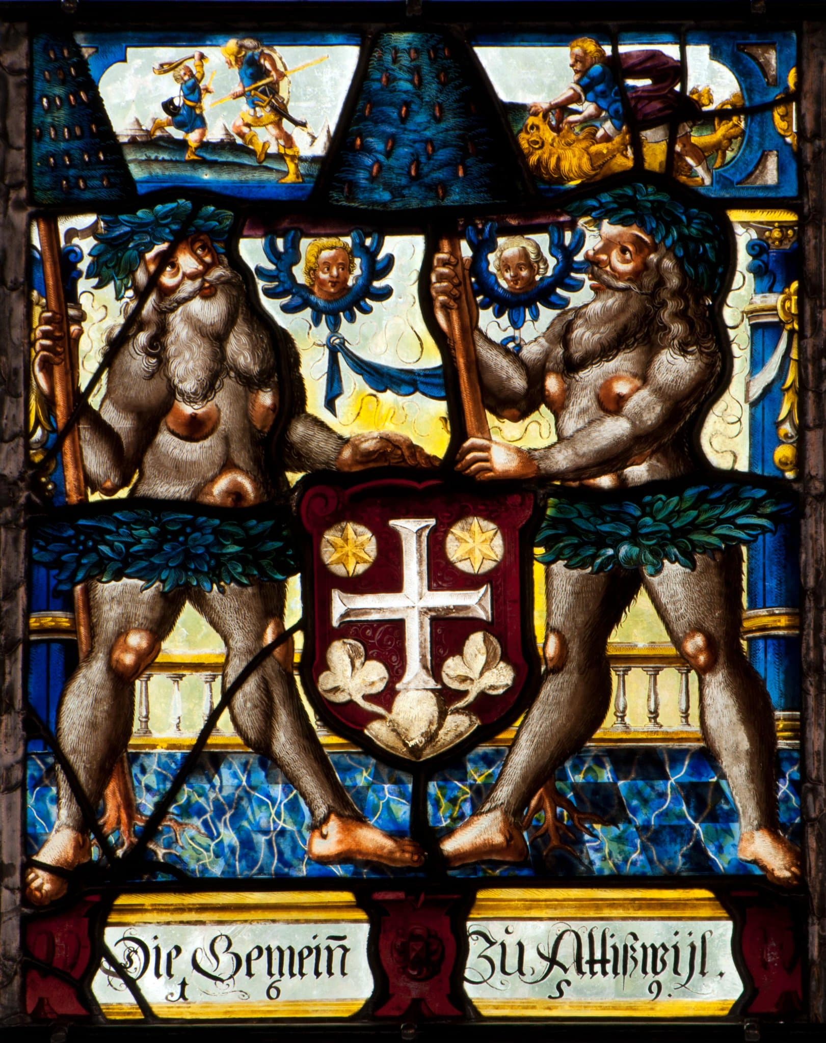 Im Zentrum erscheint das Gemeindewappen von Attiswil in Begleitung zweier mit Laubkränzen bekrönter Wildmänner, die beide eine ausgerissene Tanne in ihren Händen halten. Die zwei Schildwächter stehen vor einer niedrigen Balustrade auf dem blau marmorierten Fliesenboden des beschrifteten Podiums. Vor gelbem, schnurverziertem Grund erhebt sich hinter ihnen eine Rahmenarchitektur aus zwei blauen Säulen mit einem blauen Gebälk, von dem an zwei geflügelten Engelsköpfen eine Stoffgirlande herabhängt. Darüber ist links im Oberbild David im Kampf gegen Goliath festgehalten (1 Sam 17, 49f.). An sich läge es somit nahe, die gegenüberliegende Szene als Davids Löwenkampf (1 Sam 17, 34–37) zu interpretieren. Als Vorbild dazu diente Hans Ulrich II. Fisch vermutlich aber eine Darstellung von Simsons Löwenkampf (Ri 14, 5f.). In vergleichbarer Form begegnet man Simson als Löwenbezwinger beispielsweise in Rissen Daniel Lindtmayers aus dem beginnenden 17. Jahrhundert (Hasler 1996/97, Bd. 2, Kat.-Nrn. 534a, 536). Die Szene dürfte hier deshalb eher auf Simson denn auf David zu beziehen sein.