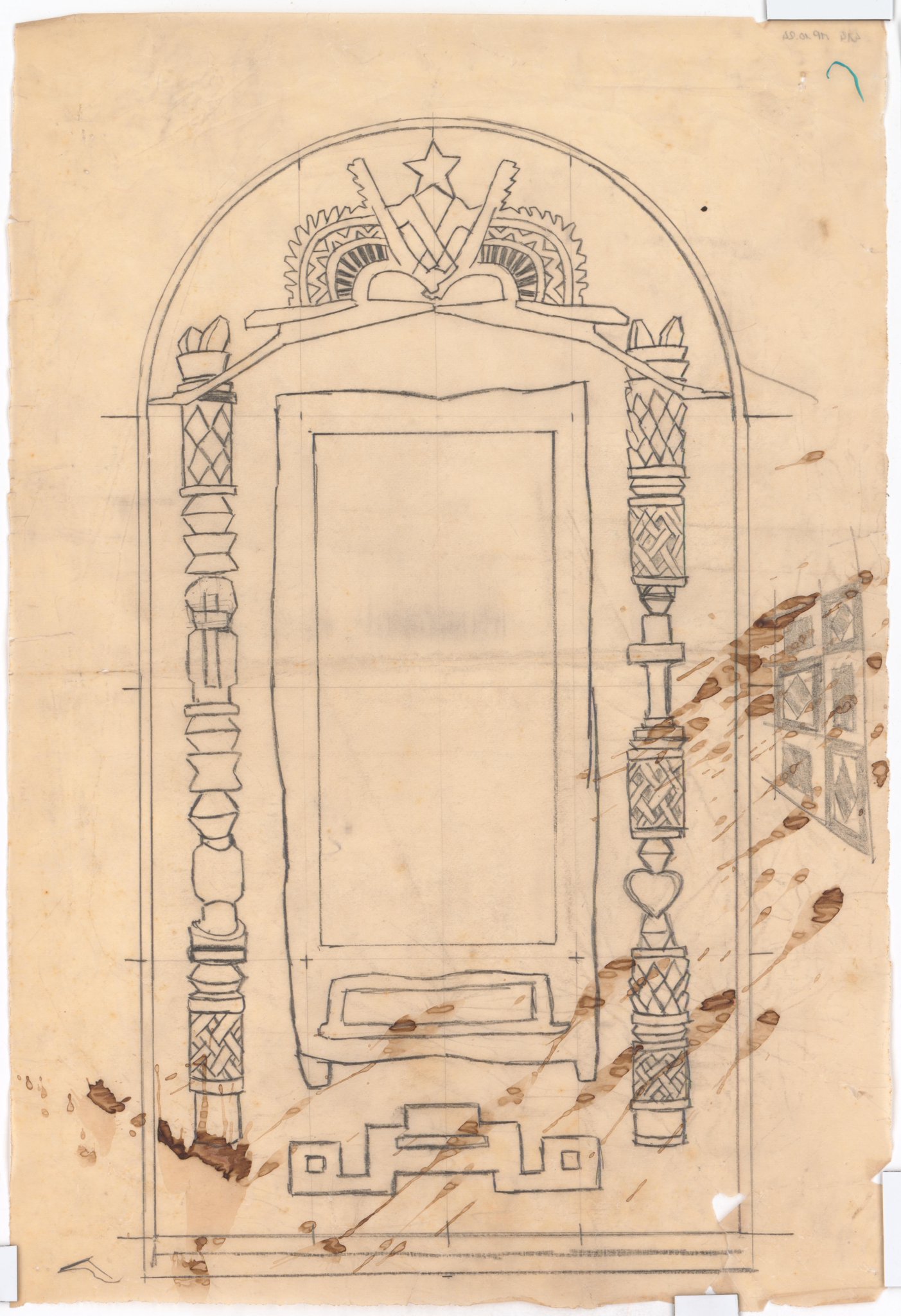Louis et Marcel pensaient à l'origine réaliser seulement six vitraux avec des figures de roi et de prophètes en camaïeu, et deux fenêtres décoratives contenant des prophéties, avant de s'orienter vers huit vitraux avec des prophètes uniquement et en couleur, en automne 1943. Cette maquette correspond à l'un de ces premiers projets avec une prophétie, dont il s'agit ici de l'encadrement. Elle peut donc être datée entre 1941 (début supposé de la commande, d'après la correspondance échangée entre l'artiste et son frère, le chanoine Poncet) et 1943. Cf: Lettre de Marcel Poncet à Philipp Etter, Président de la Commission fédérale de la Fondation et chef du Département de l’Intérieur, [octobre 1943], Dossier "Vitraux, Eglise Saint-Sigismond, Saint-Maurice, 1941-1947", boîte "VITRAUX II, 1932-1947", fonds Poncet, Vitrocentre Romont.