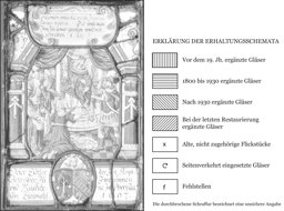 Ein kleines altes Flickstück am Rand oben links neben der Inschriftenkartusche; einige Sprünge und Sprungbleie; die Verbleiung erneuert.