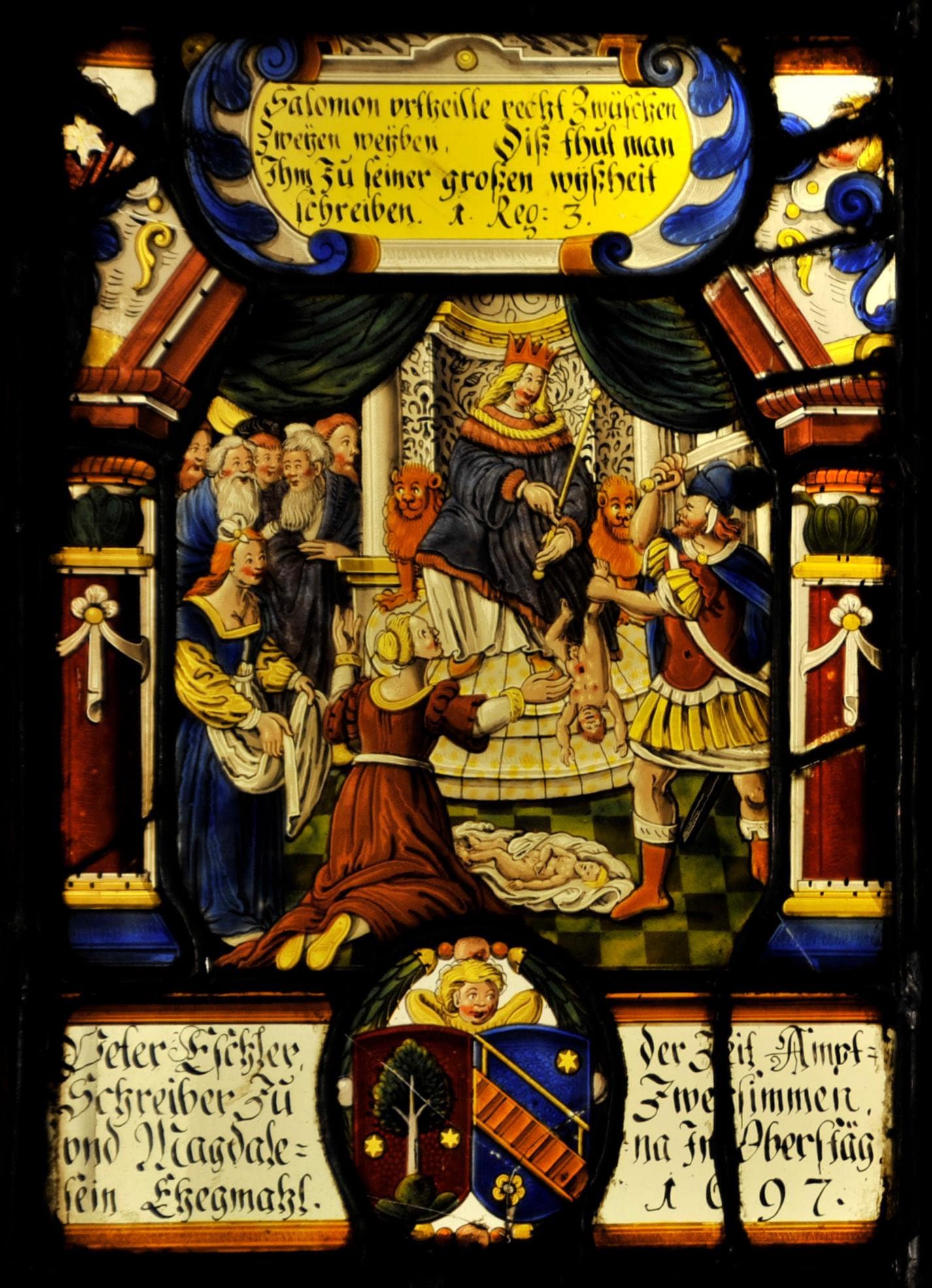 Das zentrale Figurenbild stellt das salomonische Urteil dar (1 Kg 3, 16–28). Die beiden um das Kind buhlenden Frauen haben sich vor ihrem in einer Nischenarchitektur auf dem Löwenthron sitzenden Richter eingefunden. Gekrönt und in einen violetten Mantel gehüllt, weist Salomon mit der Rechten auf das Kind in der Hand seines vor ihm stehenden Knechtes, der auf seinen Befehl hin dieses mit dem Schwert zweiteilen soll. Die Szene rahmt eine weinrote Arkade, an deren Bogenscheitel die Bildlegende in einer Kartusche angebracht ist. Die Stifterinschrift und die beiden oval umkränzten, von einem Engel gehaltenen Stifterwappen befinden sich an der Podiumsfront am Scheibenfuss.