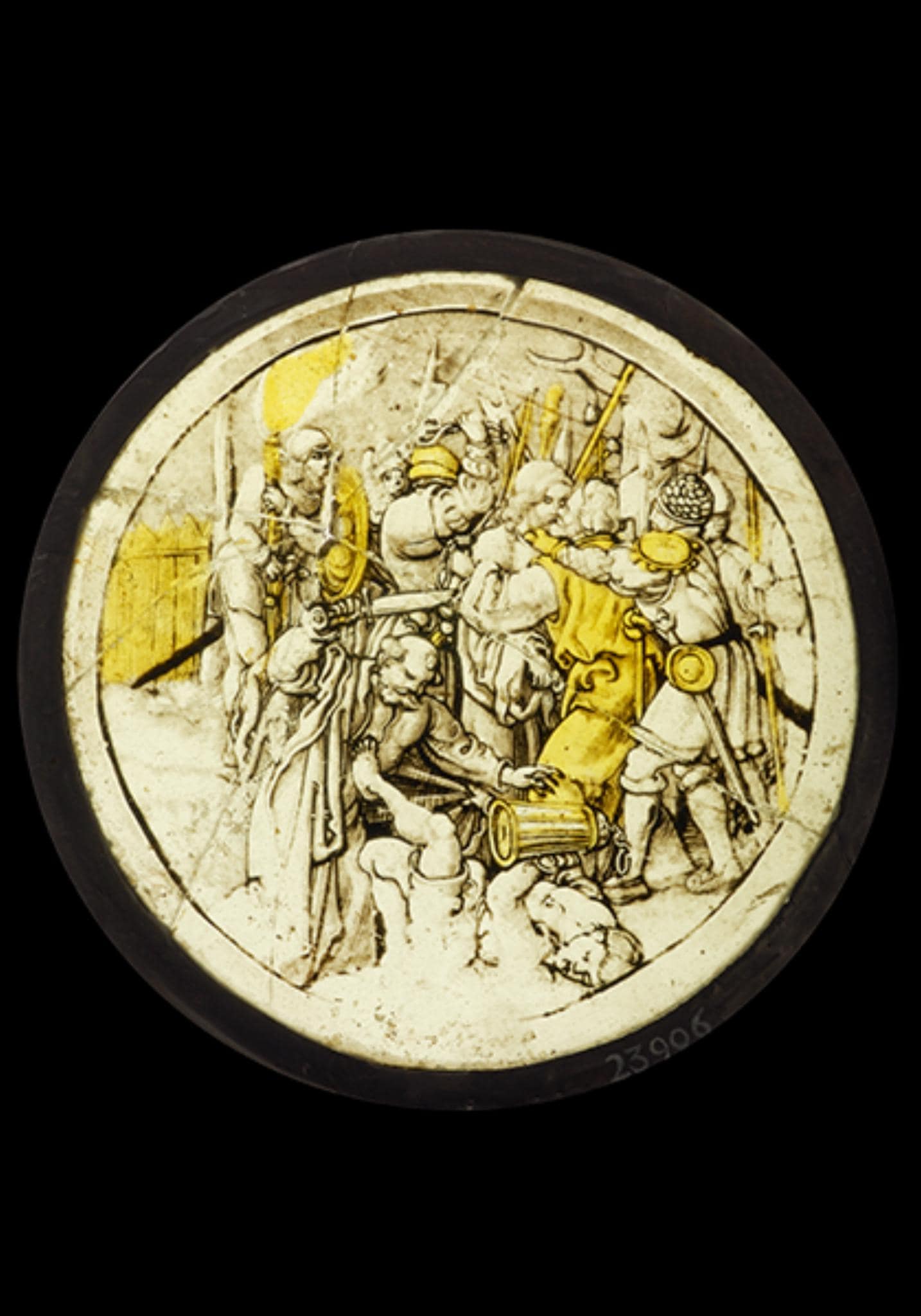Die in Grisaillemalerei ausgeführte runde Monolithscheibe zeigt die Gefangennahme Christi. Umringt von seinen Häschern wird dieser durch den in gelber Kleidung vor ihm stehenden Verräter Judas geküsst, während im Vordergrund Petrus dem Malchus das Ohr abschlägt.