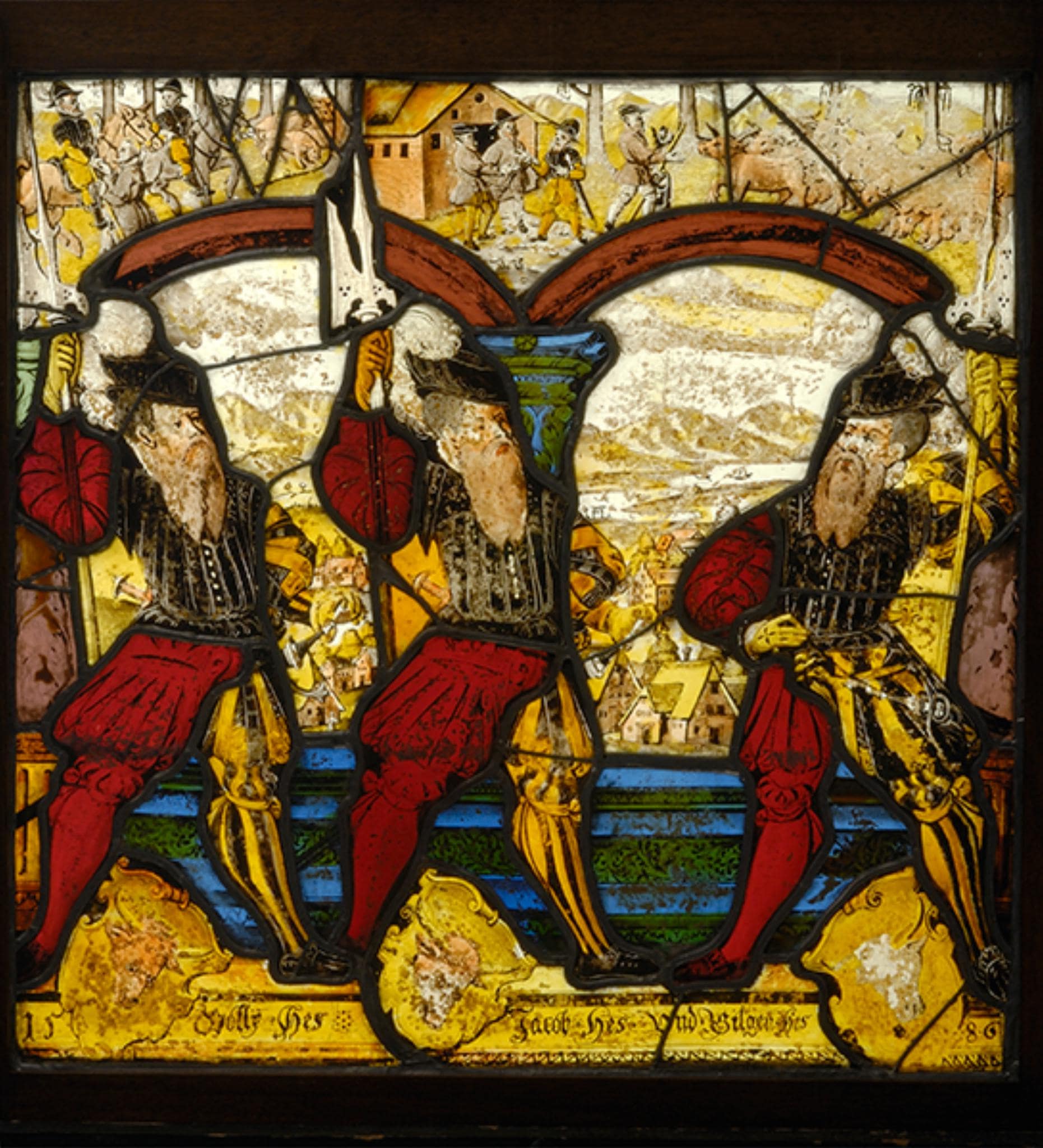 Im Vordergrund stehen breitbeinig die Stifter Ulrich, Jakob und Gilgen Hess auf dem schmalen, beschrifteten Podium. Die drei ihre Halbarte in der Hand haltenden bärtigen Männer sind alle gleich kostümiert. Sie tragen Hemd, Hose und Strümpfe in den Miparti-Farben Rot und Gelb-Schwarz gestreift sowie ein schwarzes Wams und Federbarett. Ihre Wappen ragen über das Podium zwischen ihre gespreizten Beine empor. Hinter ihnen erhebt sich eine zweiachsige Galerie aus lila Balustersäulen, einem flachen weinroten Doppelbogen und einer durchgehenden blauen Brüstung. Diese öffnet den Blick auf eine Berg- und Flusslandschaft mit einem Dorf im Vordergrund. Das Oberbild zeigt links den Empfang zweier Reiter sowie rechts die Stifter, die vor einem Gebäude mit einem Händler um eine Kuhherde verhandeln.