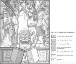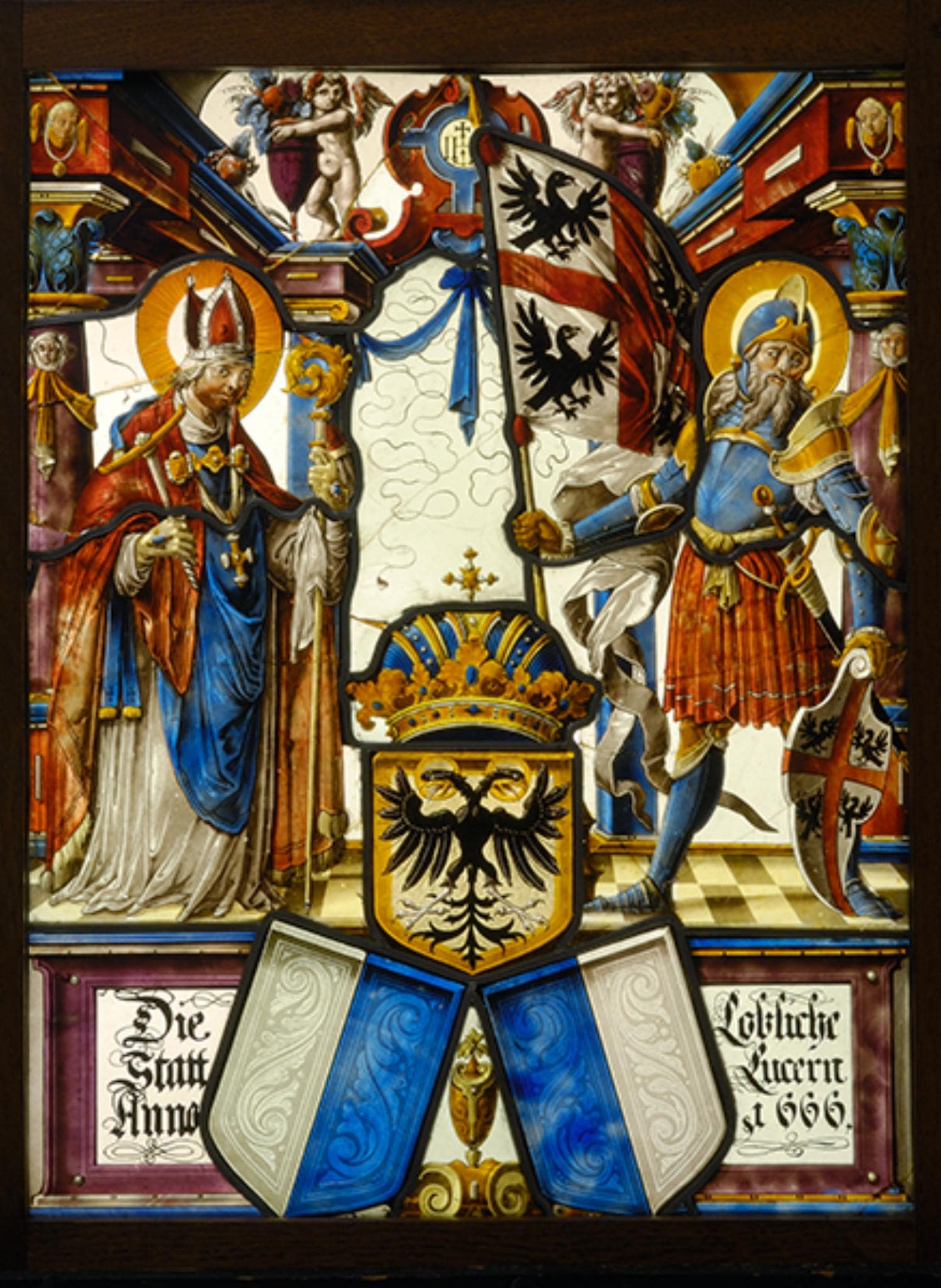 Die gekrönte Wappenpyramide Luzern-Reich ist vor das hohe Podium gesetzt, an dessen Frontseite die violett umrahmte Stifterinschrift prangt. Der geflieste Sockel dient als Standplatz für Luzerns Standespatrone, den hl. Leodegar und den hl. Mauritius. Ersterer erscheint im Bischofsornat mit dem Krummstab in seiner Linken und dem Bohrer in der Rechten. Mauritius ist in einen stahlblauen Vollharnisch und einen roten Waffenrock gekleidet. In den Händen hält er sein Banner und seinen Schild mit dem roten Kreuz und den vier auffliegenden schwarzen Adlern auf weissem bzw. silbernem Grund. Hinter den beiden Schildbegleitern erhebt sich vor farblosem, schnurverziertem Grund eine stark zurückfluchtende dreiachsige Hallenarchitektur mit blauen Pfeilern, violetten Säulen und einem roten Gebälk. Auf diesem stehen zwei von Putten gehaltene Fruchtvasen zu Seiten eines Volutenbogens und der abschliessenden Kartusche mit dem IHS-Monogramm.