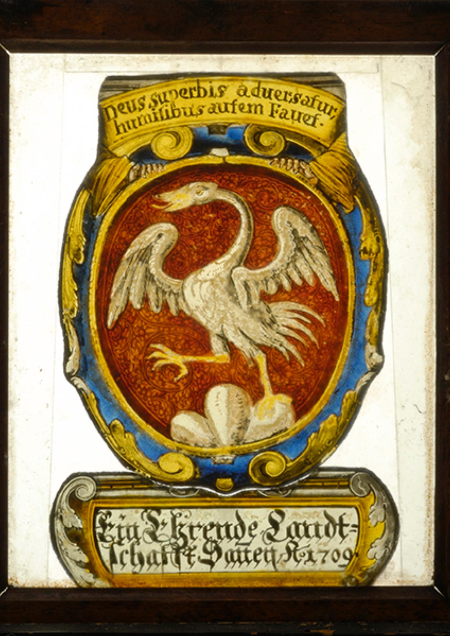 Die Landschaft Saanen wählte hier nicht den sonst üblichen Typus der Vennerscheibe, um sich präsentieren zu lassen. Die Ärmel der Schildhalter dürften darauf hindeuten, dass der Wappenschild von Engeln gehalten wurde. Diese und die Devise, die dem Brief des Jakobus entnommen ist, lassen den Schluss zu, dass die Scheibe 1709 in eine Kirche oder ein Pfarrhaus gestiftet wurde.