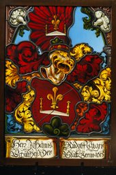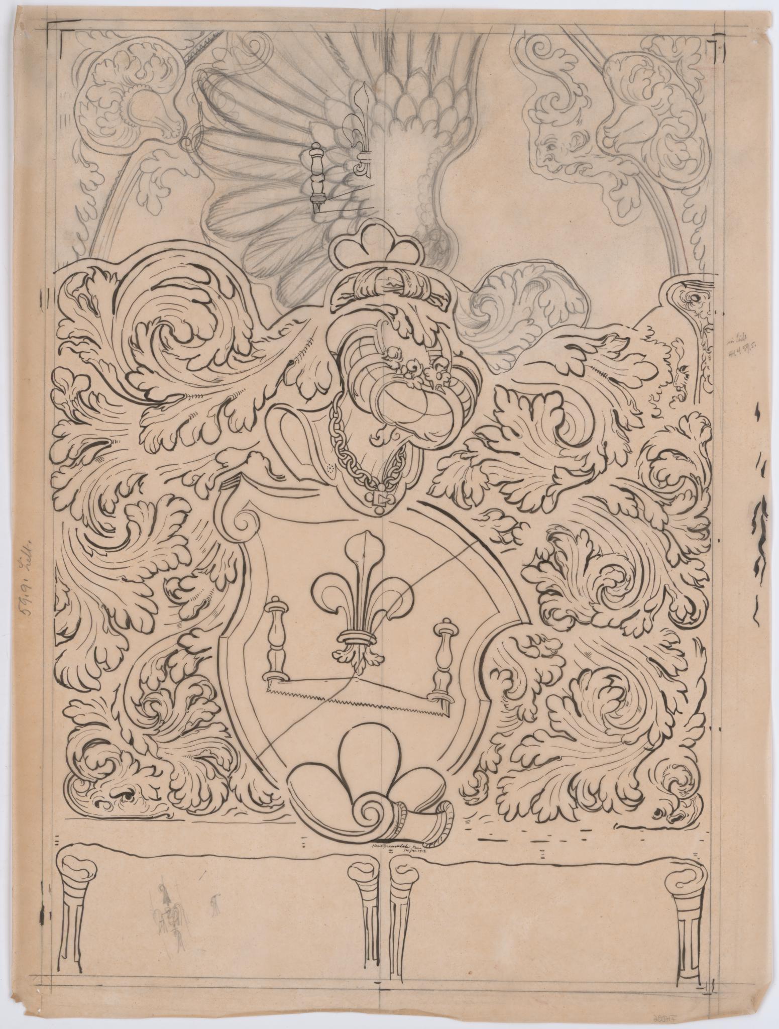 Ein weiteres ergänztes Stück rechts neben dem Wappenschild der Scheibe (siehe BE_1545) ist auf Drenckhahns Pause nicht gekennzeichnet.