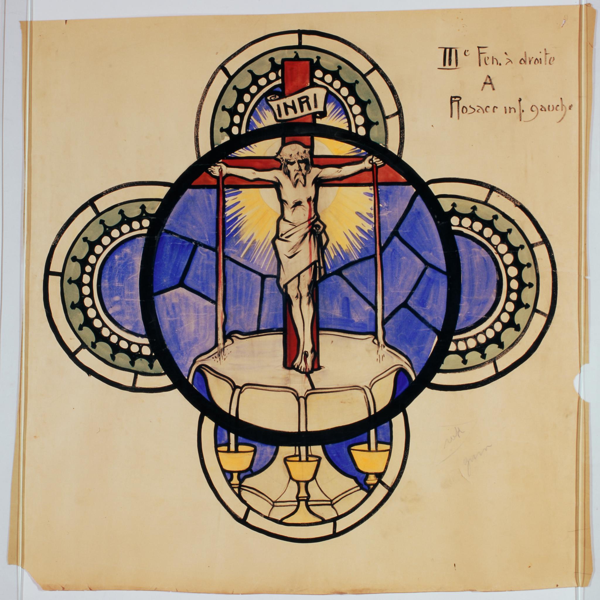Ce carton en couleur à l’échelle 1:1 est le projet définitif pour le quadrilobe inférieur gauche de la fenêtre de la troisième travée à droite dans la nef de l’église Saint-Martin de Cugy, dédiée au thème “Je crois au Saint-Esprit sanctificateur”. Cette fenêtre comprend deux autres quadrilobes dans lesquels sont représentés la colombe du Saint-Esprit et le temple de l’Esprit (Pasquier, 1999, p. 19-21).