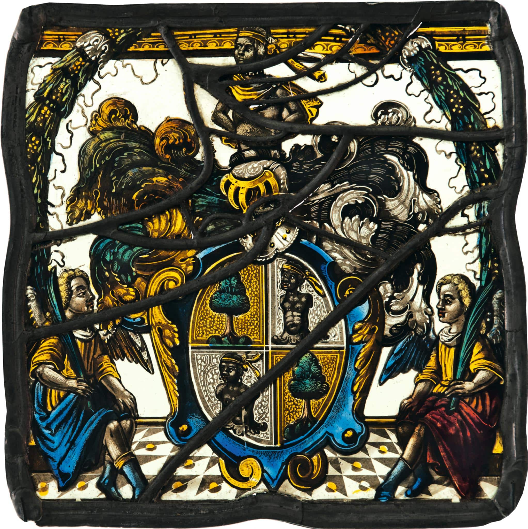 Auf einem grau-gelben Fliesenboden mit Kugeldekor steht das Vollwappen des Stifters. Zu Seiten der ovalen Rollwerkkartusche, die den Schild umschliesst, sitzen zwei Engel mit Palmzweigen. Den farblosen Grund füllen Schnurwerk und Lorbeergirlanden, die vom abschliessenden gelben Architrav herabhängen. Von der Scheibe hat sich nur das Mittelbild erhalten, der Fussteil mit der Inschrift fehlt heute ebenso wie die ehemals sicher vorhandenen Rahmensäulen.