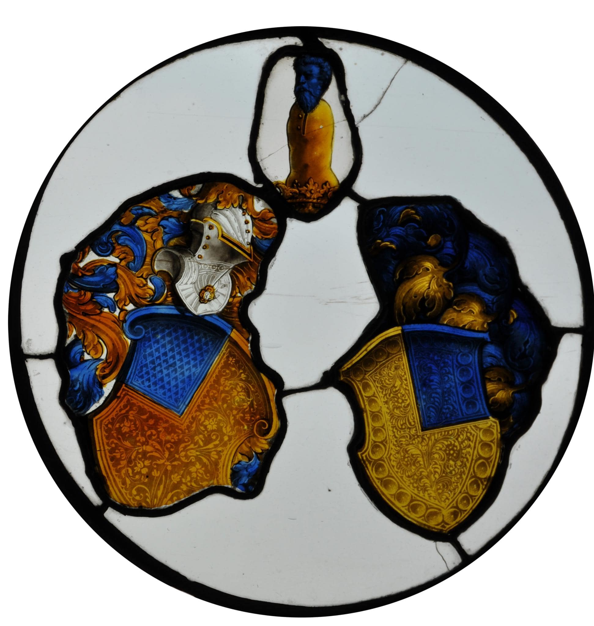 In die Rundscheibe aus Klarglas eingefügt sind drei Fragmente von zwei Zollikofer-Wappen. Dasjenige auf der linken Seite enthält zusammen mit dem Wappenschild noch den Helm und einen Teil der Helmdecke. Dazu gehört vermutlich auch das darüber separat eingesetzte kleine Glasstück mit der Zollikofer-Helmzier. Das aus einer anderen alten Scheibe stammende rechte Wappenfragment zeigt den Schild zusammen mit einem kleinen Stück der Helmdecke.