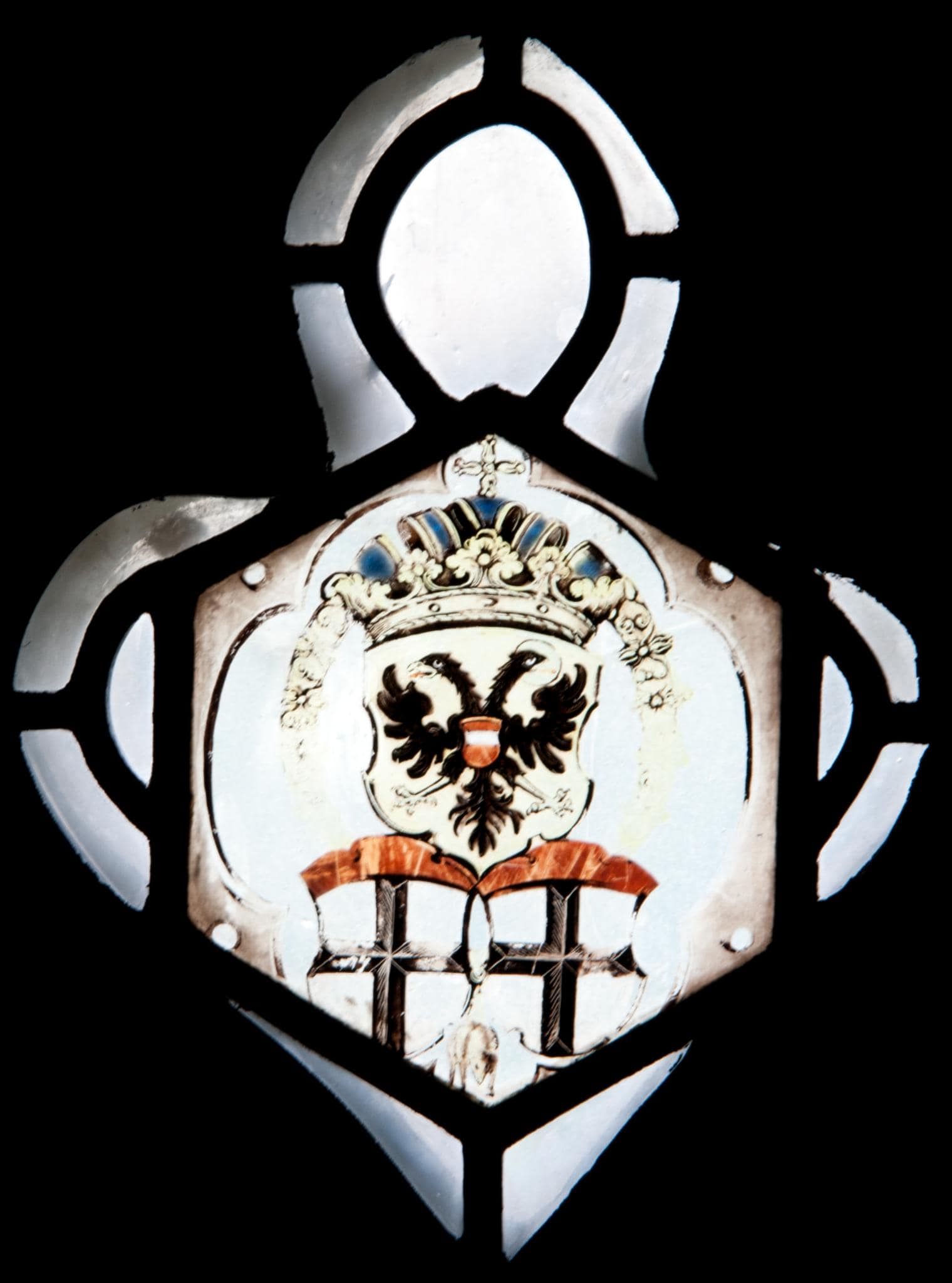Die beiden vor farblosen Grund nebeneinander gesetzten Konstanzer Stadtschilde werden pyramidenförmig von dem mit der Reichskrone geschmückten Reichsschild überhöht. Zwischen dem Konstanzer Doppelwappen hängt das Widderfell, das Ordenszeichen des Goldenen Vlieses, herab. Normalerweise ist das Vlies an der um den Reichsschild gelegten “Potence”, der Ordenskette, festgemacht (ein Beispiel dafür bietet die Konstanzer Stadtscheibe im Rathaus von Stein am Rhein; vgl. Hasler, 2010, Kat.-Nr. 162). Diese ist hier allerdings nicht festgehalten. Die Wappentrias umfasst ein einfacher Architekturrahmen in Vierpassform.