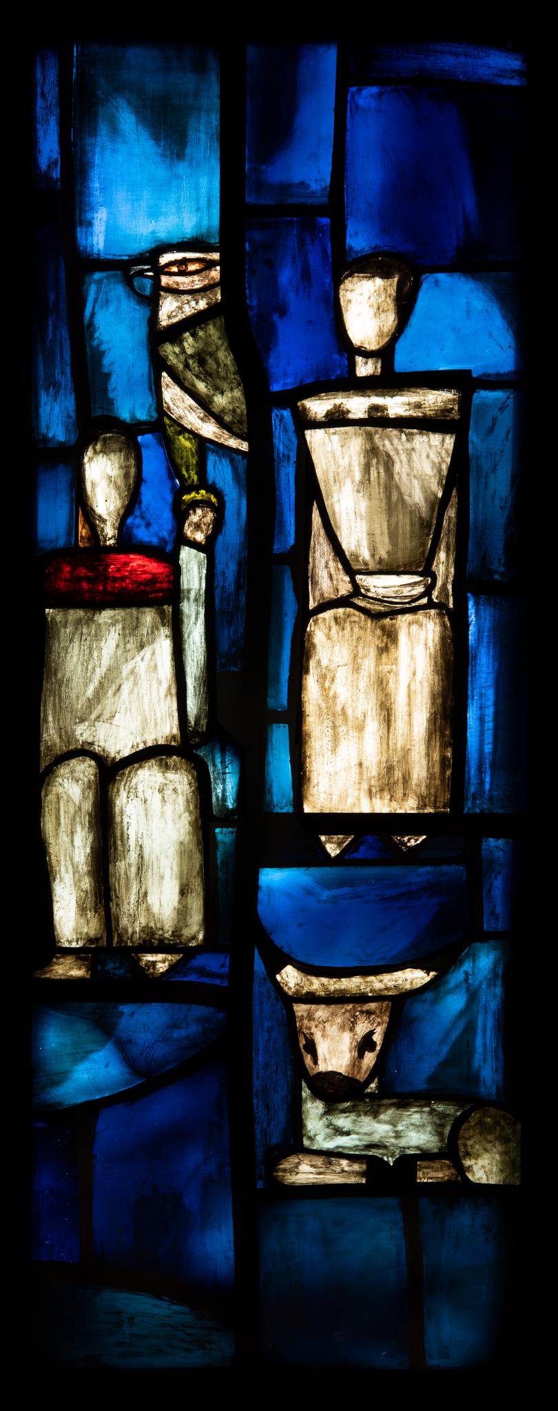 Hochrechteckiges Fenster mit den sitzenden hellen Figuren zweier Evangelisten und ihrer Symbole vor dunkelblauem Hintergrund. Links Johannes mit dem Adler auf seiner linken Hand, rechts Lukas mit dem Stier zu seinen Füssen. Einzelne gelbe und rote Farbakzente.