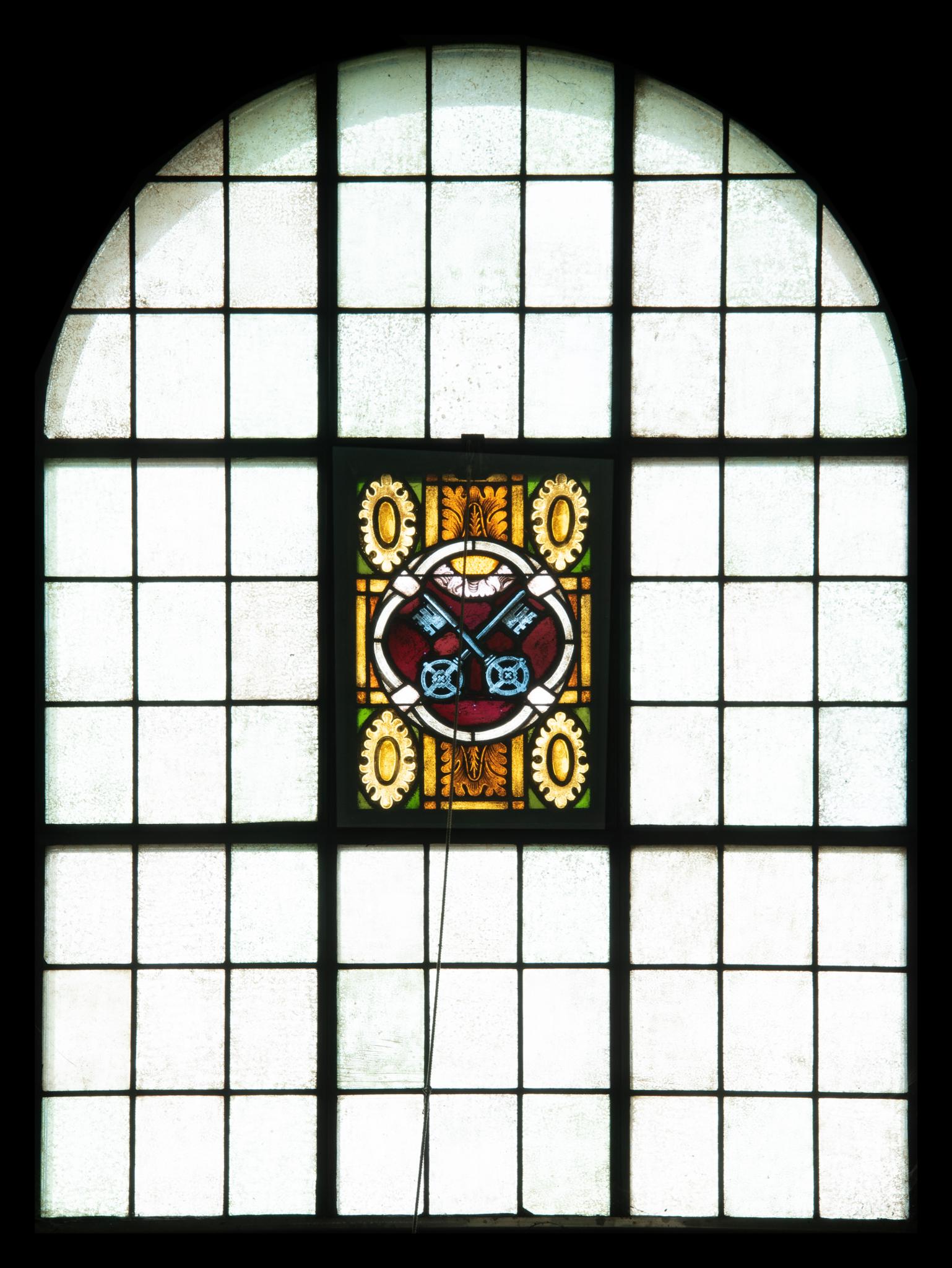 Mit opaken Rechtecken blank verglastes neunteiliges Rundbogenfenster. Im mittleren Feld eine Darstellung des Sakraments der Busse in einem Medaillon vor ornamentiertem Hintergrund. Das Sakrament ist verbildlicht durch zwei gekreuzte Schlüssel.
