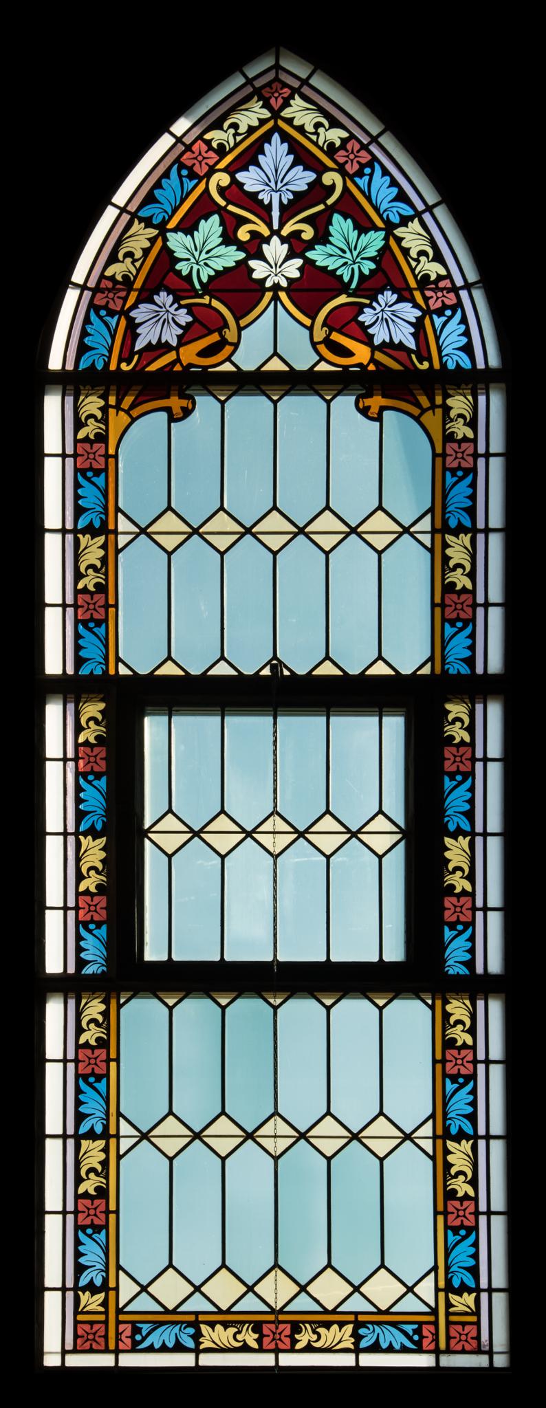 Mit gelb-rot-blauem Zierrahmen eingefasstes Spitzbogenfenster. Das Mittelfeld ist in “Schweizerrauten” unterteilt, wobei die kleineren Rauten aus gelblichem Glas bestehen. Im Bogenfeld Weinblätter auf rotem Grund.