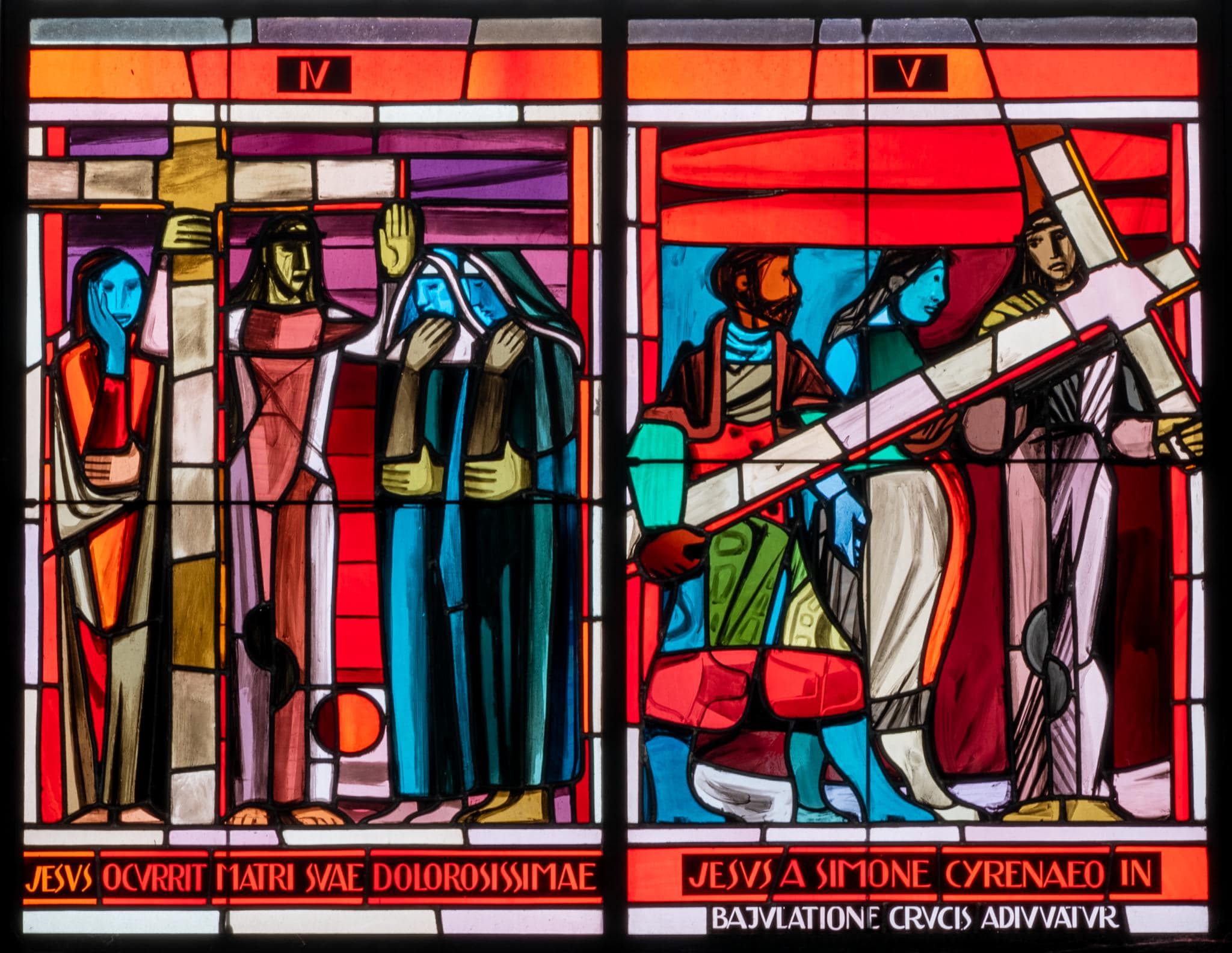 Rundbogenfenster mit blanker Rautenverglasung. Im unteren Teil des Fensters die vierte und fünfte Station des Kreuzweges: Links steht Christus neben dem Kreuz und erhebt die Hand, Maria und zwei weitere Frauen stehen daneben. Rechts hilft Simon von Kyrene Christus, das Kreuz zu tragen.