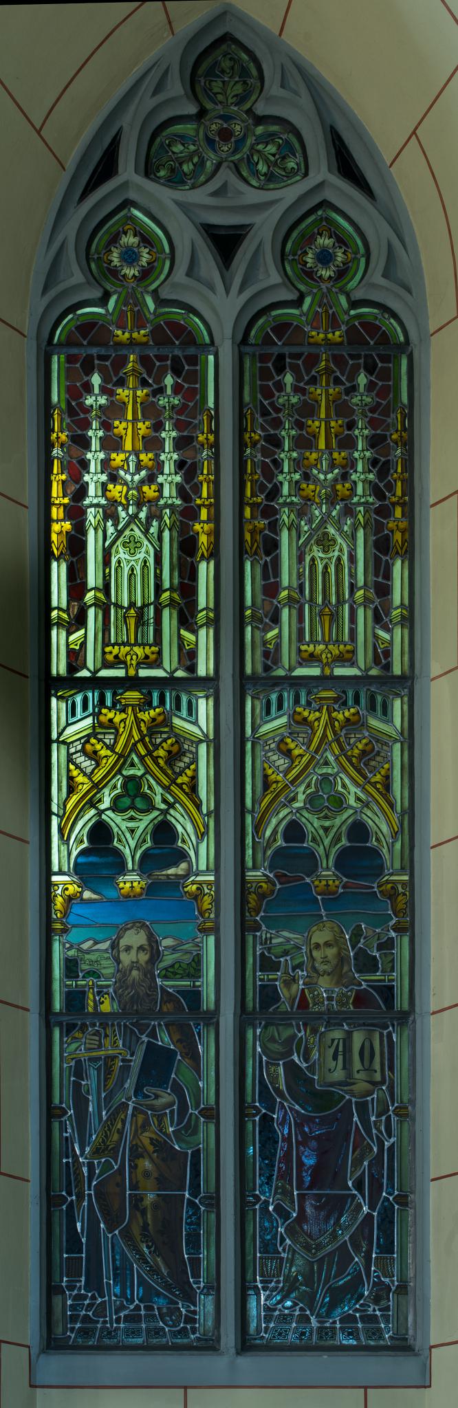 Neugotisch gestaltetes zweilanzettiges Masswerkfenster mit den beiden Heiligen in aufwändigen Rahmungen mit gemalten Architekturelementen. Links Paulus mit Schwert und Buch, rechts der Apostel Johannes, die rechte Hand zum Segen erhoben, in der linken das aufgeschlagene Evangelium. Die beiden Heiligen stehen vor einem Vorhang mit Damastmuster, im Hintergrund ist eine stilisierte Landschaft zu sehen. Die gemalten architektonischen Rahmungen im Stil der Gotik mit Masswerkbogen, Fialen und Krabben (identisch mit s V). Masswerk und Couronnement mit Blatt- und Blumenmotiven.