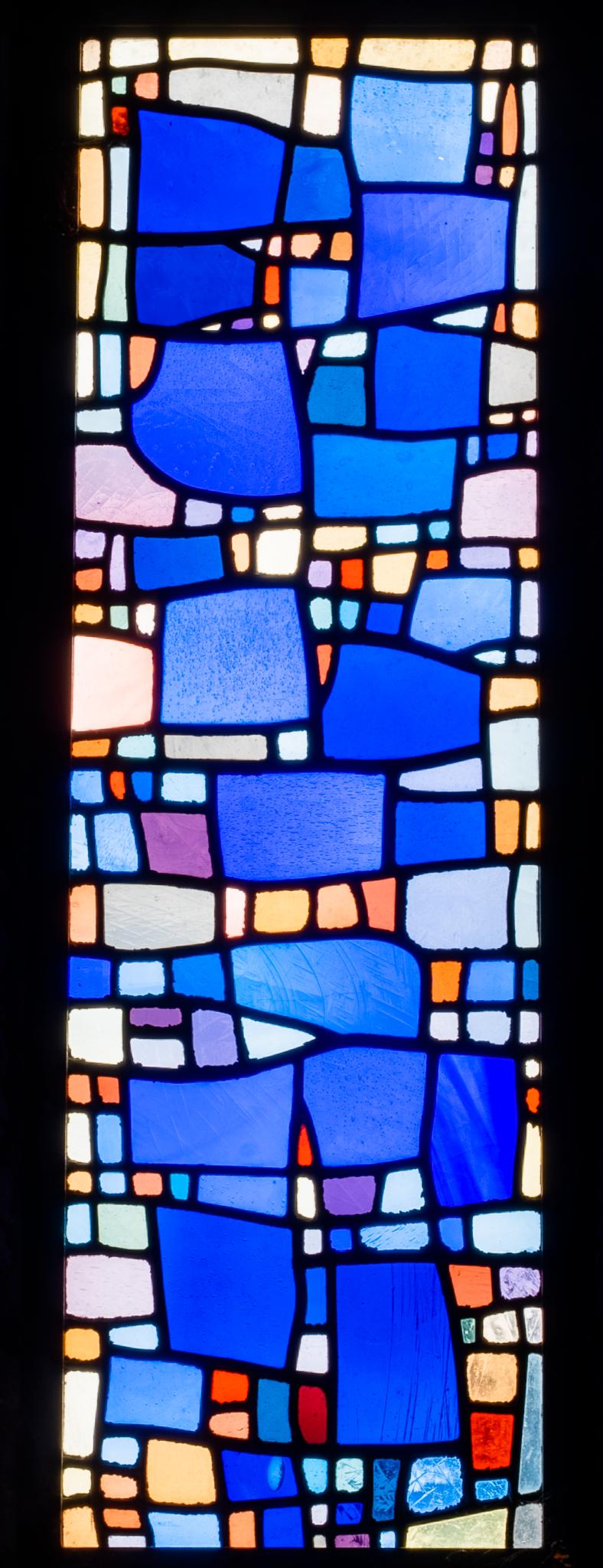 Abstraktes Glasgemälde aus grossen blauen sowie kleinen weissen, roten und gelben Glasstücken.