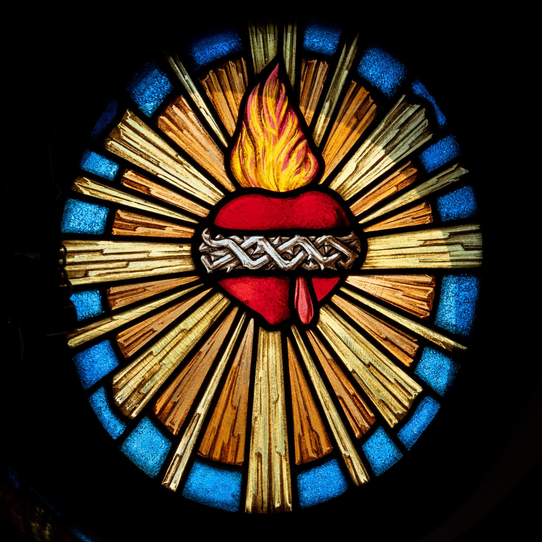 Längsovales Fenster mit dem brennenden, mit Dornen umwundenen und einem Blutstropfen versehenen Herz Jesu im Strahlenkranz.
