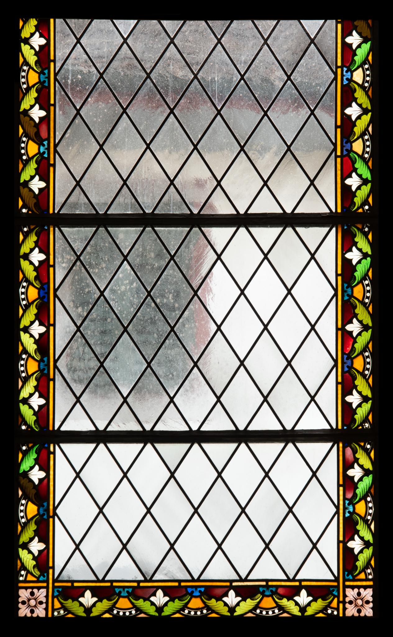 Sechsteiliges Rundbogenfenster mit Rautenverglasung und Zierrahmen mit stilisiertem Pflanzenfries.