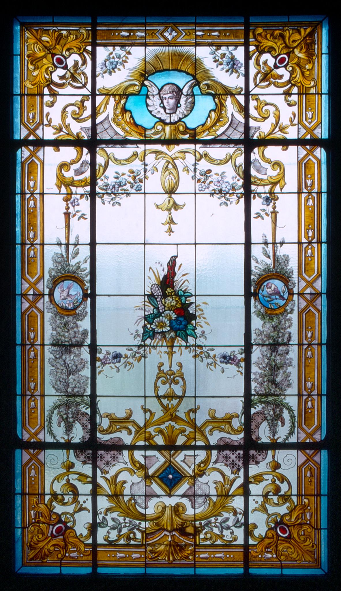 Rechteckiges Fenster mit reicher ornamentaler Verglasung. In einen Rahmen mit geometrischem Banddekor und reich gestalteten Eckübergängen ist ein zweiter üppig gestalteter Rahmen mit Rocaillen, Netzornamenten, Blumengirlanden und Pflanzenzweigen eingeschrieben. Im zentralen Bildfeld Blumenbouquet, das aus dem unteren Teil der Rahmung entspringt. Darüber geflügelter Engelskopf in Kartusche, links und rechts je ein kleines Rundmedaillon mit Vogeldarstellungen.