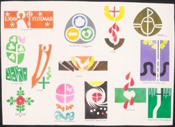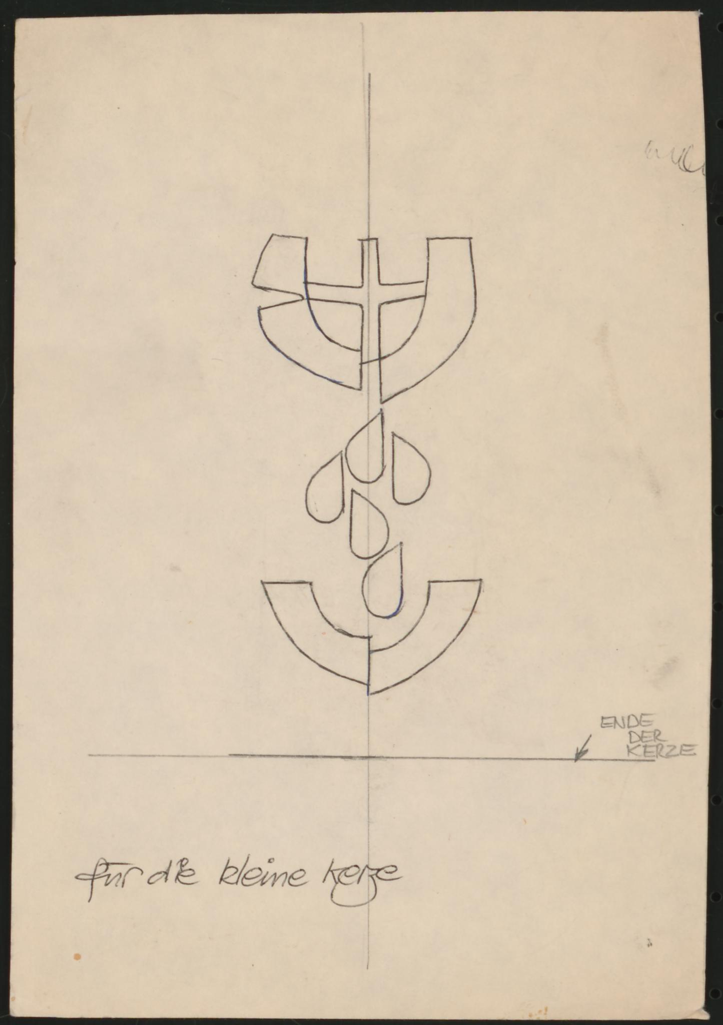 Eine interessante Facette von Heinrich Stäublis künstlerischem Schaffen war die Gestaltung von Signets für Osterkerzen. Handschriftliche Notizen auf dieser Skizze geben an, in welchem Grössenverhältnis das Signet zur Kerze vorgesehen war. Handschriftliche Anmerkungen auf der Rückseite der Skizze lassen darauf schliessen, dass 100 Stück zu einem Preis von CHF 350 in drei Farben hergestellt werden sollten. Eine später entstandene Collage von Osterkerzensignets und Logos für Gemeinden und Vereine (HS_496) zeigt dieses Signet farbig ausgeführt.