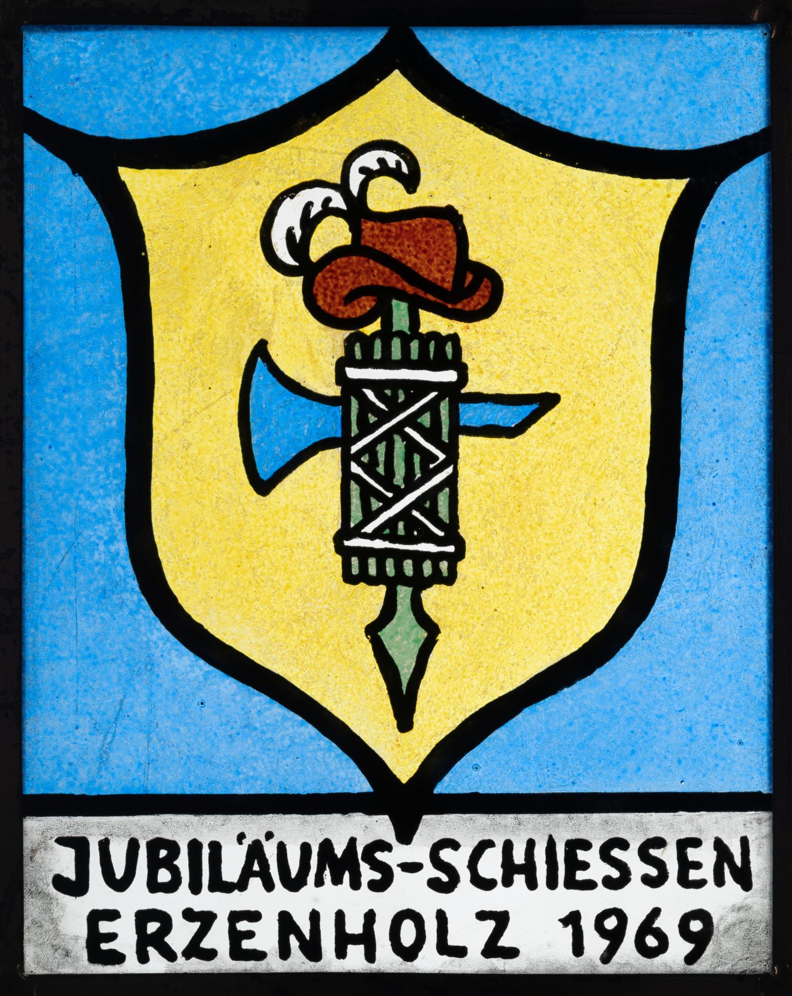 Wappen Feldschützengesellschaft Erzenholz: In Gold blaue Hellebarde, belegt mit zweifach kreuzweise von einem silbernen Band umwundenen grünen Stäbebündel (Fasces) mit sechs sichtbaren Stäben und einer grünen Lanze in ihrer Mitte, darauf ein roter Schützenhut mit zwei silbernen Federn.