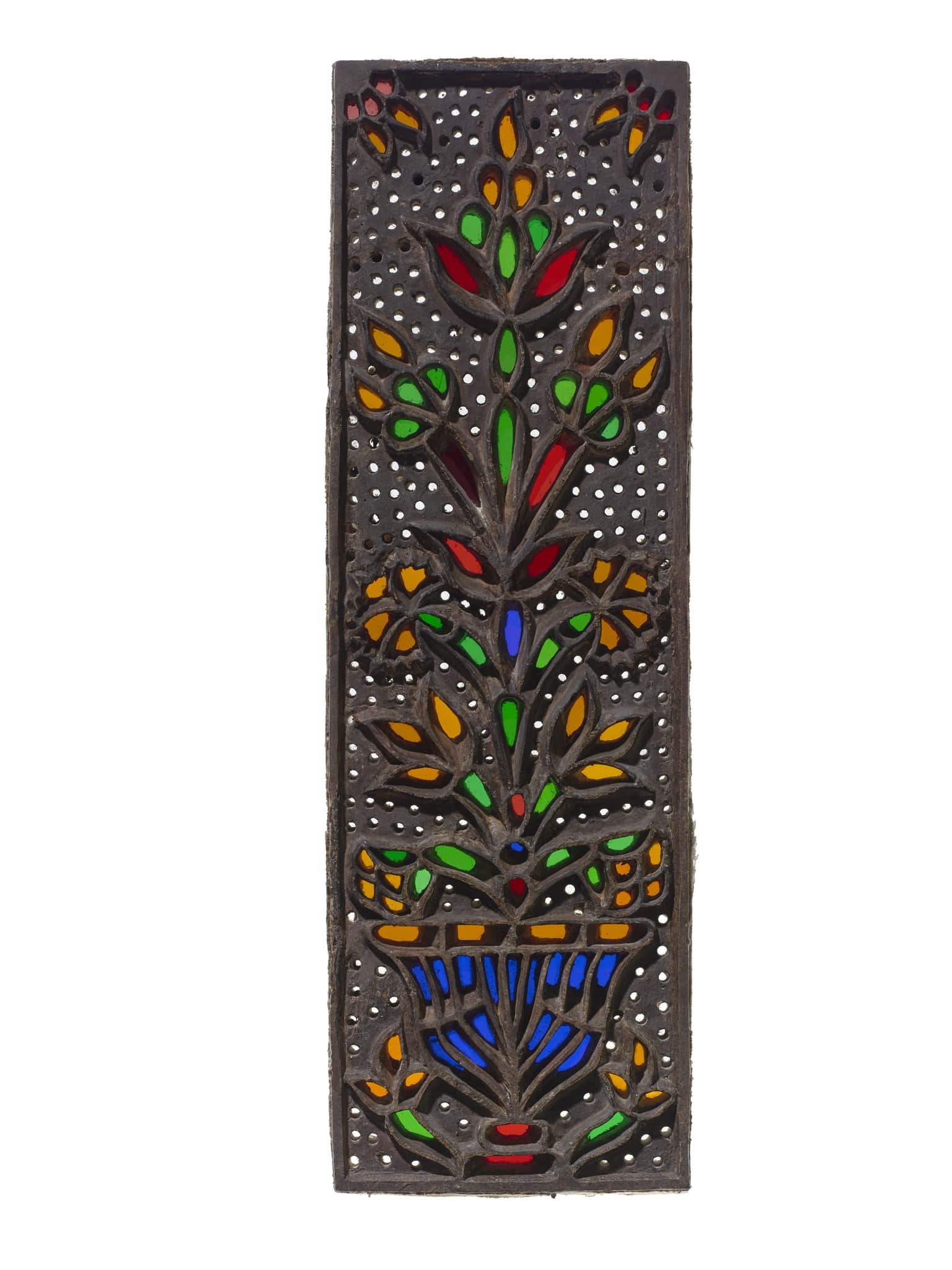 The Louvre window discussed here differs from other windows of the same type because of its elongated shape, which indicates its use as a framing element for a central stucco and glass panel. This explains why, instead of a bouquet of several flowers, only one vertical flower stem in bloom is depicted. An almost identical composition can be found in stucco and glass window OA 7466/9 (IG_9), also held at the Musée du Louvre, which was most probably made at the same workshop. The colours and material properties of the glass and the stucco lattice work – although heavily restored – suggest that the window dates to the late 19th century. This assumption is supported by the results of an analytical study of glass from two stucco and glass windows from the Louvre collection (OA 7466/7, OA 7466/25) conducted by a team from the Musée du Louvre (Fellinger et al., 2022).