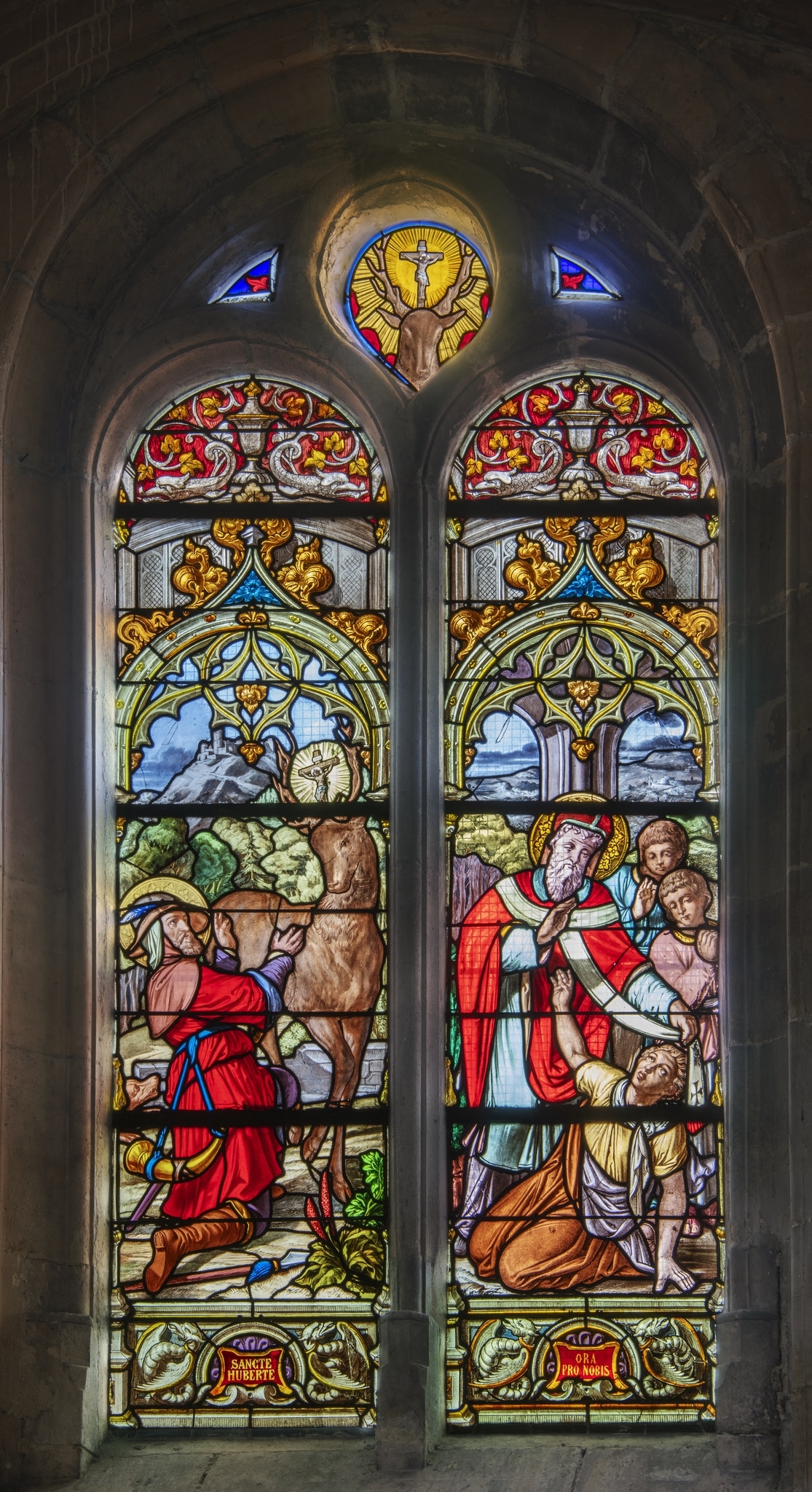 Masswerkfenster mit zwei in Rundbogen endenden Lanzetten, darüber kopfstehendes, tropfenförmiges Couronnement. Unter zwei mit Vasen besetzten Baldachinen, die Elemente im Stil der Gotik und der Renaissance vereinen, sind gefasst von architektonischen Rahmen zwei Szenen zur Vita des heiligen Hubertus von Lüttich gezeigt. Links seine Bekehrung: Auf der Jagd am Karfreitag trifft Hubertus auf einen prächtigen Hirsch mit einem Kruzifix zwischen den Sprossen des Geweihs. Mit erhobenen Armen kniet Hubertus, auf dem Kopf den Jägerhut, am Gürtel das Jagdhorn, vor dem Tier. Seinen Speer hat er abgelegt. Im Hintergrund ist eine Burgenlandschaft dargestellt. Rechts Hubertus im Bischofsornat: Er heilt einen vor ihm knienden Besessenen, indem er diesen segnet und seine Stola über den Kranken legt. Dahinter stehen zwei Kinder mit gefalteten Händen. Der unterste Bereich der beiden Lanzetten ist als architektonischer Sockel mit Drachen und Inschriftenkartuschen gestaltet. Im Couronnement ein Hirschkopf mit einem Kruzifix im Geweih.