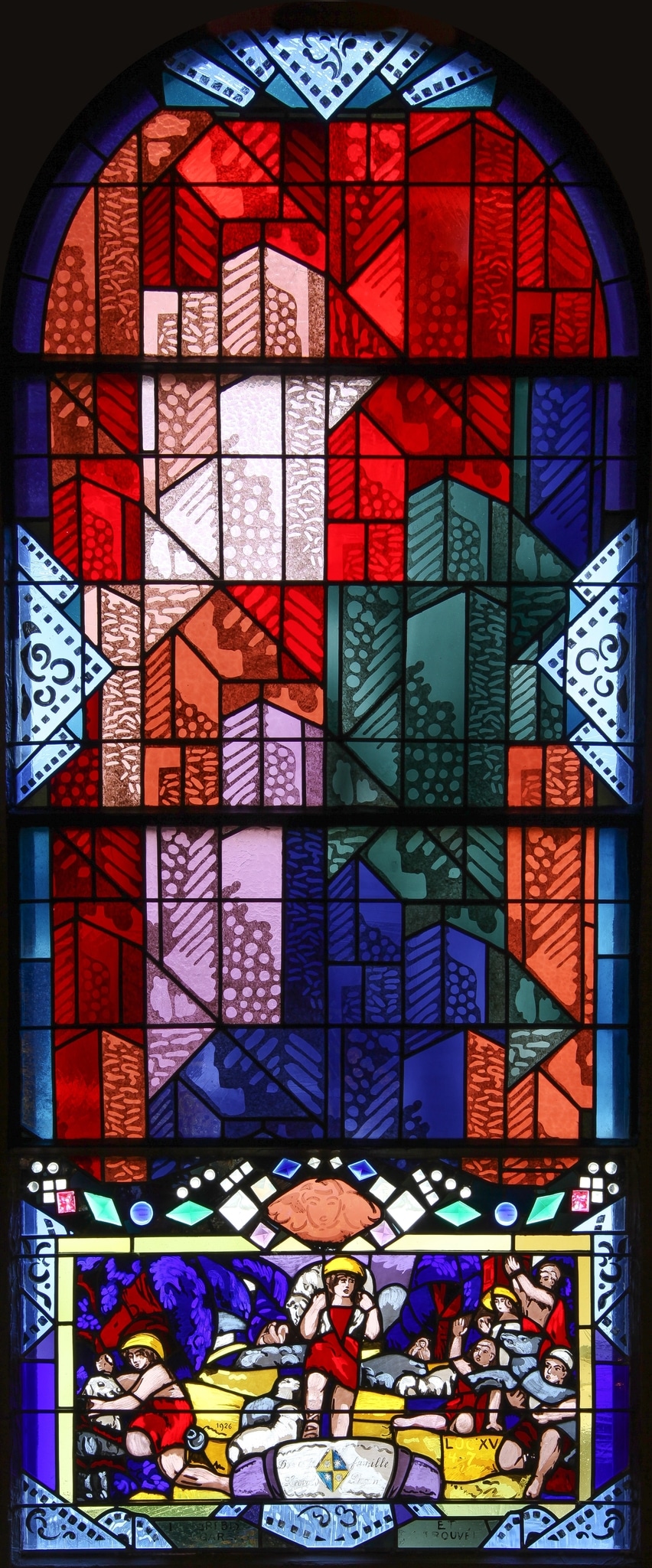 Une guirlande multicolore de cabochons et verres structurés sépare les deux secteurs, avec au centre une tête d’ange ailé inscrite dans un losange.