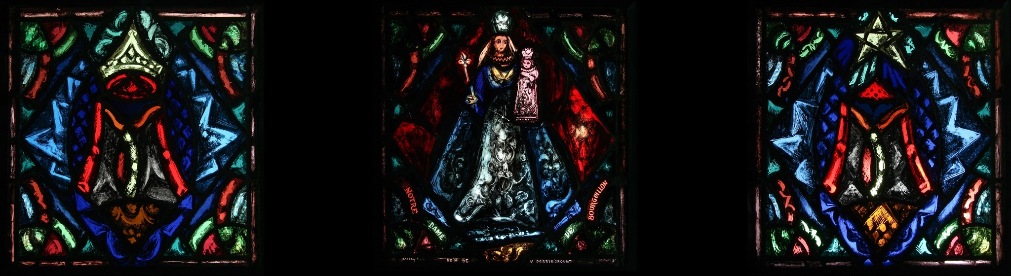 Les vitraux de Landry soulignent l’interaction qui existe entre son travail de peintre de chevalet et de peintre-verrier (Reymond, 1995). Ils se caractérisent par un important travail à la grisaille appliquée avec une touche de peintre très vive. Sur ces trois petits vitraux à l’iconographie mariale, il l’utilise abondamment sur les verres en épargnant certaines zones, faisant d’autant plus ressortir l’éclat des couleurs. Il traite les motifs de la robe de la Vierge de Bourguillon en grattant cette grisaille à l’aide d’une aiguille ou d’un petit bois, révélant le bleu clair du verre au-dessous. Il inscrit également le motif central de chaque fenêtre au sein d’un losange et favorise un découpage des verres dans des formes géométriques rappelant le cubisme, apportant dynamisme et modernité à ses compositions.