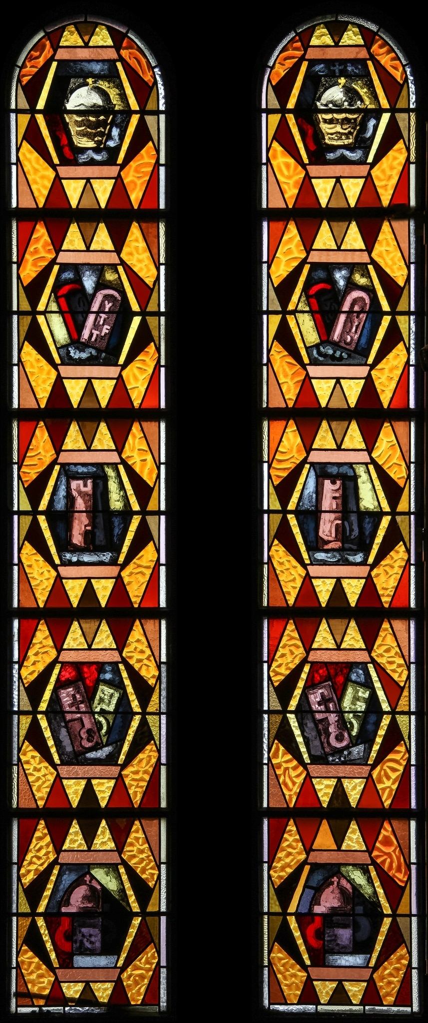Fenêtre double en plein cintre composée de cinq panneaux comprenant chacun en leur centre un médaillon hexagonal sur un fond losangé. Chaque hexagone comporte un motif symbolique différent, peint à la grisaille. De bas en haut, on trouve la représentation stylisée de la basilique Saint-Pierre de Rome, reconnaissable par son dôme et sa colonnade, les clés de saint Pierre, une tour, les tables de la loi et la tiare pontificale. Les symboles se répètent à l’identique sur la fenêtre de gauche et sur celle de droite, avec de légères variations.