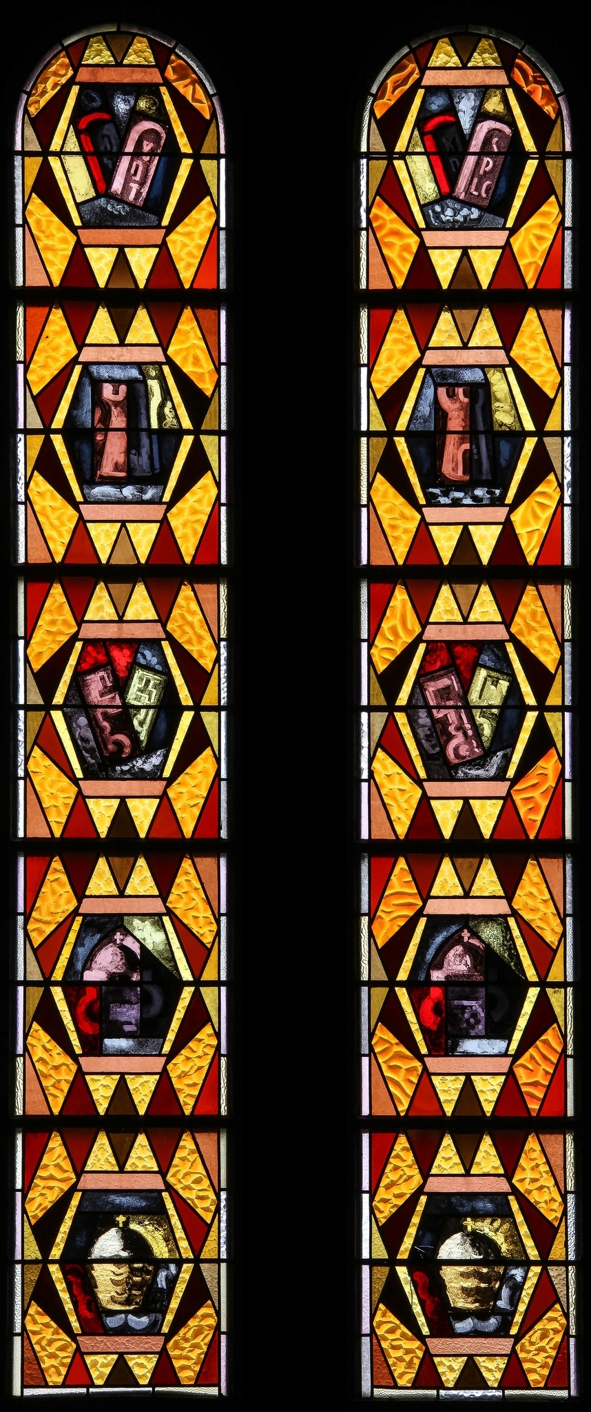 Fenêtre double en plein cintre composée de cinq panneaux comprenant chacun en leur centre un médaillon hexagonal sur un fond losangé. Chaque hexagone comporte un motif symbolique différent, peint à la grisaille. De bas en haut, on trouve la tiare pontificale, la représentation stylisée de la basilique Saint-Pierre de Rome, reconnaissable par son dôme et sa colonnade, les clés de saint Pierre, une tour, et les tables de la loi. Les symboles se répètent à l’identique sur la fenêtre de gauche et sur celle de droite, avec de légères variations.