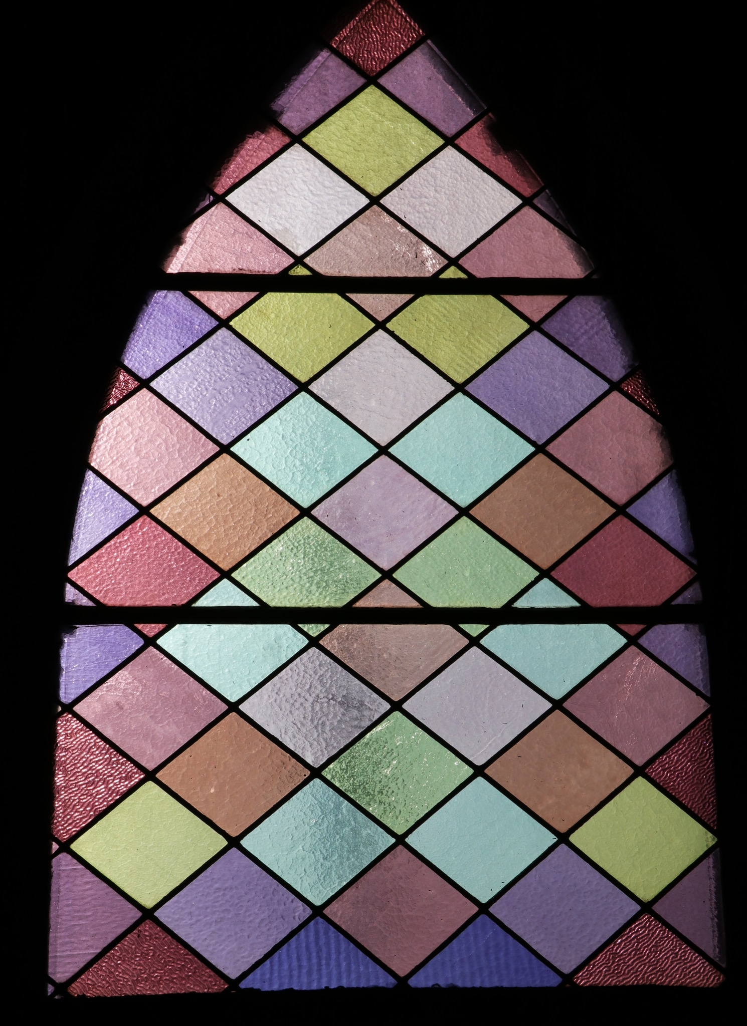 Cette baie en lancette est composée d’un vitrail à losanges colorés de différentes nuances de teintes (rose, mauve, bleu, jaune et vert) élaboré avec des verres à textures variées.