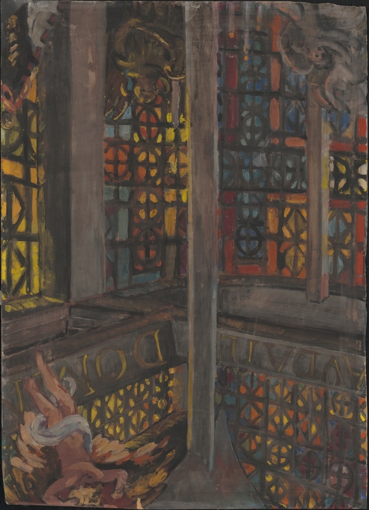 Cette présente maquette montre une vue de la chapelle se situant à l’angle des parois nord-est, nord-ouest. L’artiste propose une représentation presque photographique de cet espace, à l’exception des anges qu’il rajoute dans les coins ainsi que l’inscription ne figurant pas dans la réalité. Cette peinture témoigne du dialogue subtil élaboré par l’artiste entre tons chauds et froids pour les dalles de verre inscrites dans les claustras des parois de béton. Ce n’est pas la première fois que Cingria peint l’intérieur d’un édifice pour lequel il travaille, en 1930 il fait de même à l’église de Lutry (VMR_1034), où il fut non seulement le décorateur mais aussi l’auteur de l’ensemble des vitraux.