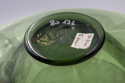 Ce modèle de coupe (134) fut créé à une période précoce de la Verrerie artistique (1930-1964). Les sources dont nous disposons sont des catalogues de la Verrerie de St-Prex, certains inédits, tels que les albums noirs munis de photographies de vases, vraisemblablement utilisés par les représentants de 1931 à 1935, où il est référencié comme coupe en verre vert, soit gravée à l’acide, soit unie. (Verreries de St-Prex, 1931). Ce modèle fait également partie de l’offre du premier catalogue de vente imprimé de 1935 (Verreries de St-Prex, 1935, 7), où il est présenté en verre vert.