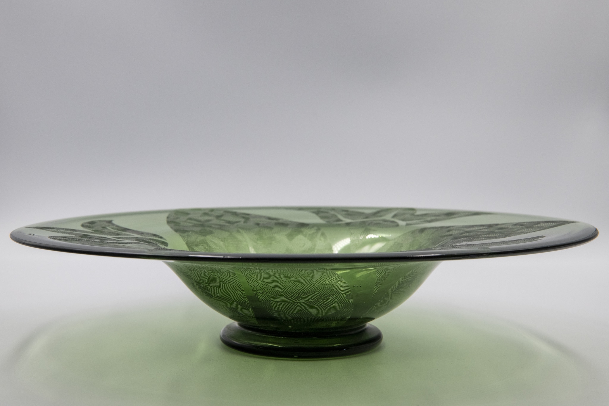 Verre vert, soufflé en moule, pied appliqué, décor chenille gravé à l'acide; forme: évasée