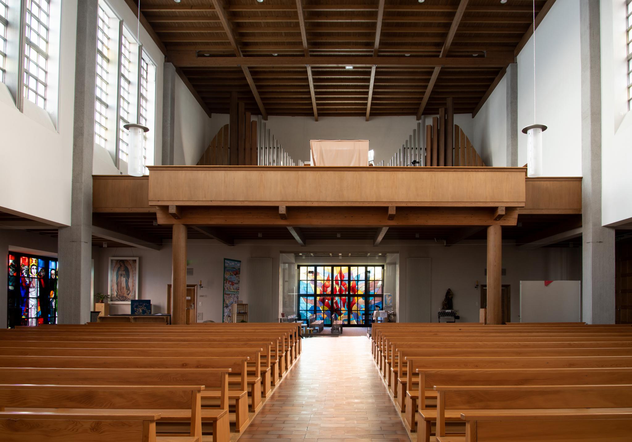 Betonkonstruktion von Paul Büchi aus Amriswil, 1939. Aus der Bauzeit Glasgemälde von Otto Staiger. Monumentalfenster Hl. Geist 1995 von Yoki. Ein 1947 datiertes Rundfenster von August Wanner in der Bruder-Klausen-Kapelle.