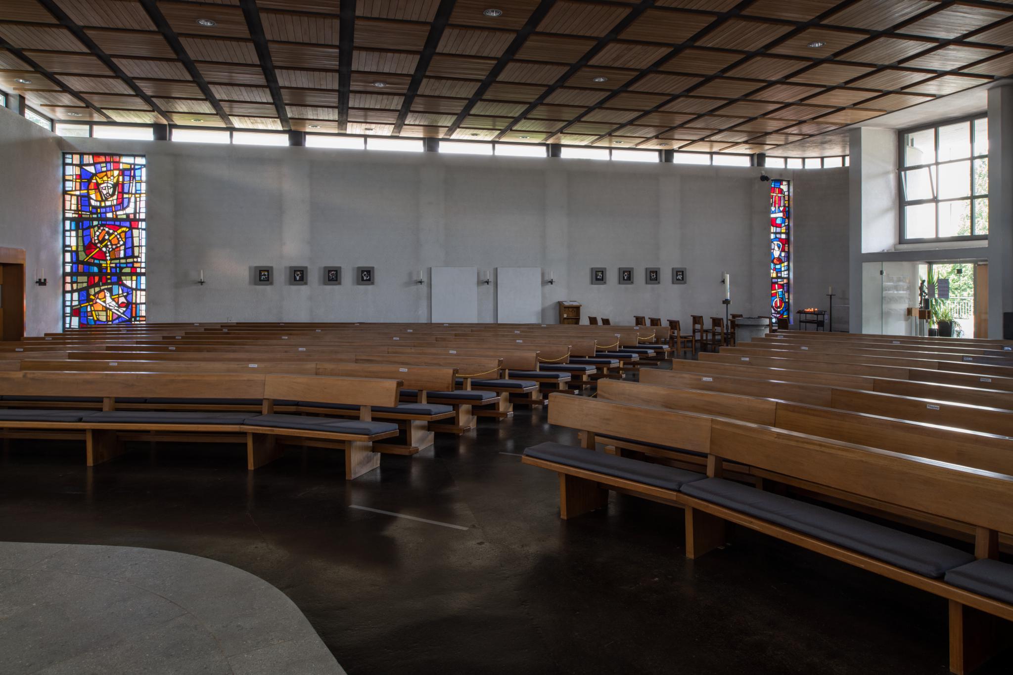 1963 von Otto Sperisen erbaut. Zwei bauzeitliche Betonverglasungen von Yoki, ausgeführt in der Freiburger Werkstatt Kirsch & Fleckner.