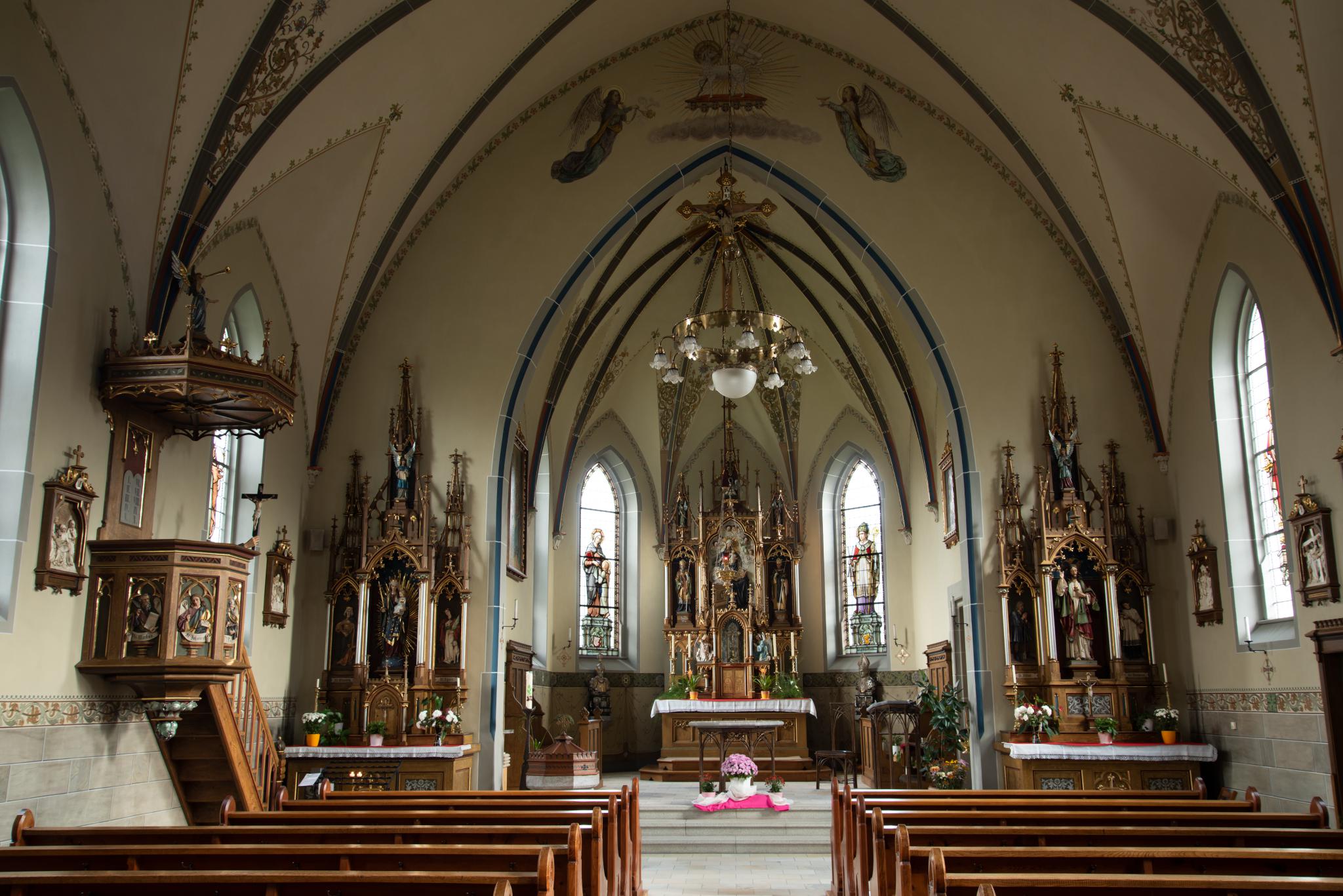 Nach dem Brand der alten paritätischen Kirche und der Auflösung des paritätischen Verhältnisses 1911–13 errichtete neugotische Anlage von Albert Rimli. Schlichter Langhausbau unter Satteldach, im Osten Polygonalchor und Chorflankenturm mit Sakristeiannex, im Westen Vorraum. Glasfenster mit Heiligendarstellungen von Lütz & Elmpt, 1913. Innenrestaurierung 1991/92, damals auch Sicherung der Glasmalereien.