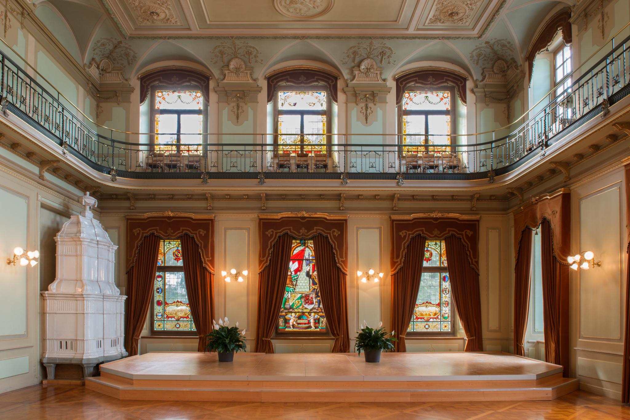 1888 schuf Friedrich Berbig drei grosse Glasgemälde für den Bürgersaal. Adolf Kreuzer hatte damals ebenfalls Entwürfe geliefert (vgl. TG_2104). Als dieser 1899 erhöht und mit einer Galerie versehen wurde, schuf Berbig 1901 drei weitere Glasmalereien. Entwürfe für diese Fenster liegen von Berbig sowie von Jakob Lieberherr vor (vgl. TG_2107). 1993 fertigte die Werkstatt Engeler ein weiteres Glasgemälde für den Saal.