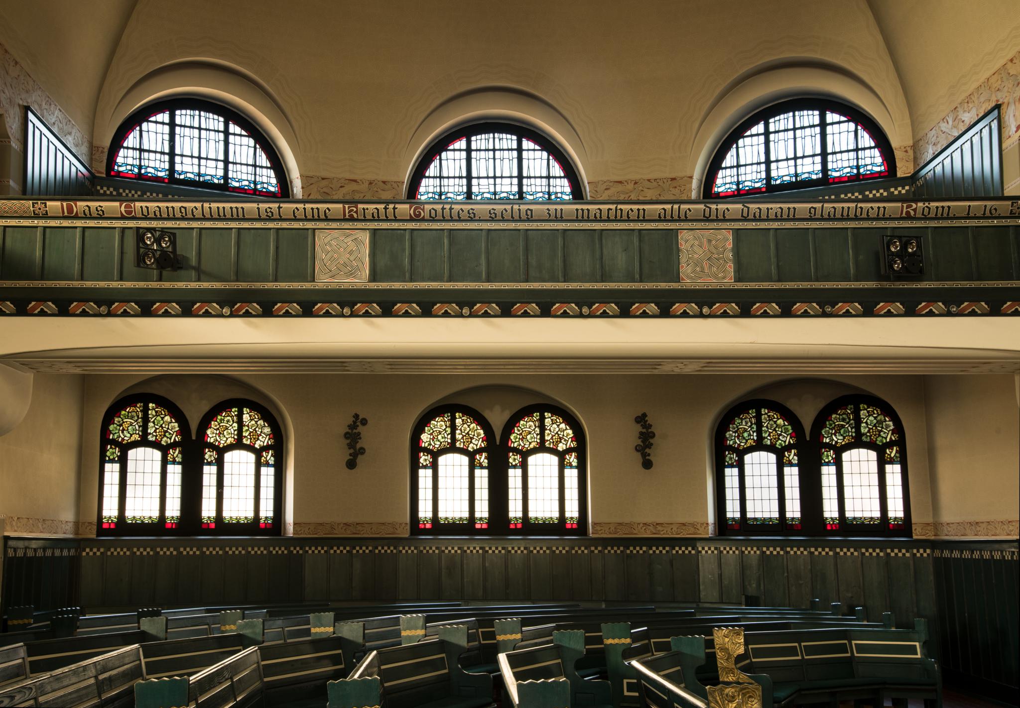 Zentralbau auf kreuzförmigem Grundriss mit Vierungsturm. Wuchtige äussere Erscheinung, jedoch intimer Predigtsaal mit kuppelüberwölbtem Vierungsraum und vier Emporen. Kunsthandwerklich bis ins Detail durchkomponierte Ausstattung, darunter Glasmalereien von Jakob Georg Röttinger und Heinrich Huber-Stutz nach Entwürfen von Christian Jakob Schmidt. Restauriert 1976/77 durch Scherrer & Hartung.