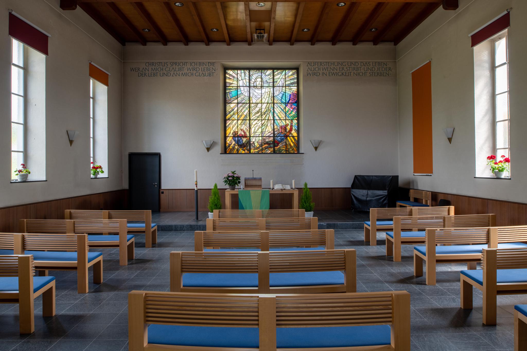 Erbaut 1936–37 von Ernst Sturzenegger. Auferstehungsfenster 1946 nach Entwurf von Ulrich Hänny.